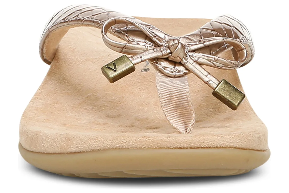 Vionic Bella is a chic and stylish toe post sandal. These trendy and comfortable summer shoes have textured synthetic uppers, lightweight EVA midsoles and sturdy rubber outsoles. A microfiber-covered footbed, breathable textile lining and feminine bow detail outlines this versatile summer sandal.These sandals have Vionic Technology that biomechanically cushions arches, helps to alleviate heel pain and plantar fasciitis and has received an APMA Seal of Acceptance.