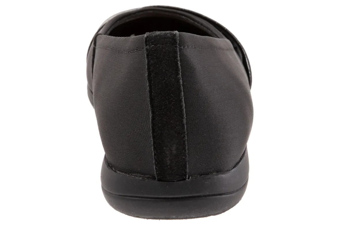 Danni is an essential flat with mixed materials and asymmetric detailing. A grippy rubber sole and removable cushioned footbed with arch support make for all day comfort.