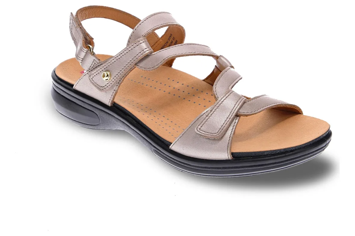 We’ve struck the perfect balance of contemporary design and optimum comfort when creating the Emerald sandals. Crafted from soft luxe leather, these women’s sandals with adjustable straps cradle the foot so you feel supported as you stroll. This 3 strap sandal fits both narrow and wide feet and has a molded footbed that can be easily removed to fit your orthotics, AFO’s or braces.FEATURES- Premium leather upper and lining.- Contoured footbed with arch support- Removable footbed to insert custom orthotics, AFO’s and braces- Received APMA Seal of AcceptanceSIZE & FIT- Fits true to size- Those between sizes may consider a size bigger or opt for the wide fit- Adjustable straps- Includes revere strap extensions for a wider fit