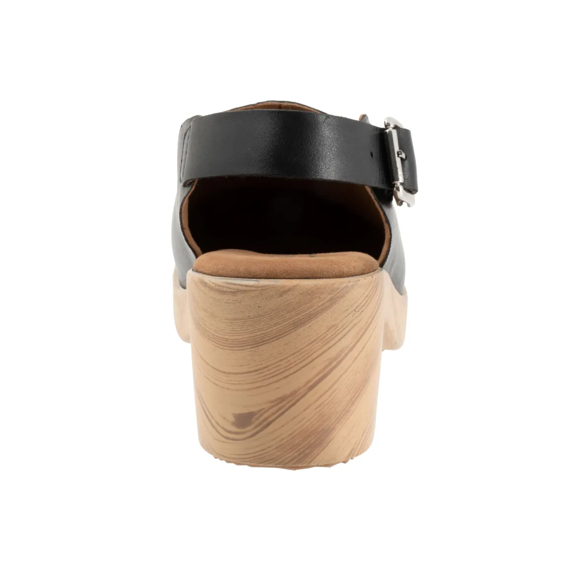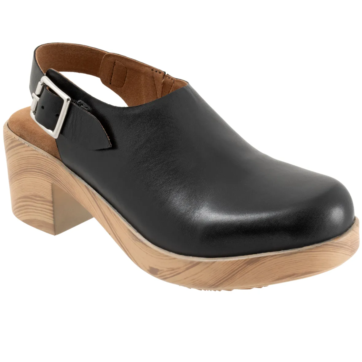 The Fairbanks sling has a sole with the look of a wooden clog but is actually a lightweight polyurethane sole with rubber insert on the outsole for sure footing. The Fairbanks features an inner elastic goring as well as elastic goring built into the adjustable buckle for a comfortable and flexible fit. The cushioned footbed is lined in soft suede leather and has arch support.