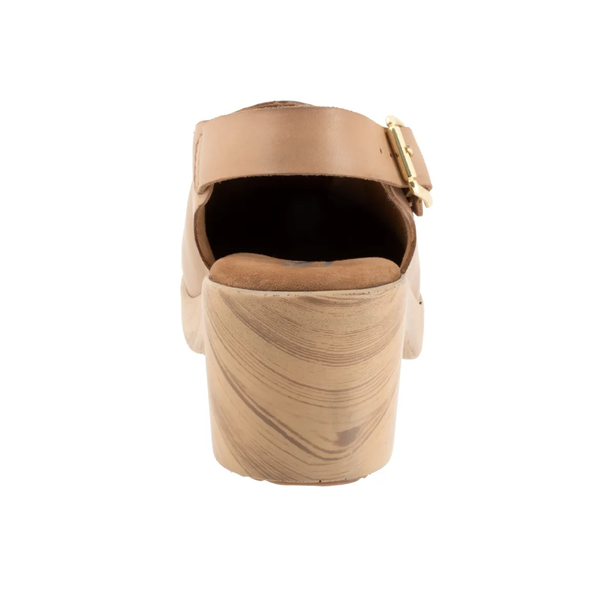The Fairbanks sling has a sole with the look of a wooden clog but is actually a lightweight polyurethane sole with rubber insert on the outsole for sure footing. The Fairbanks features an inner elastic goring as well as elastic goring built into the adjustable buckle for a comfortable and flexible fit. The cushioned footbed is lined in soft suede leather and has arch support.