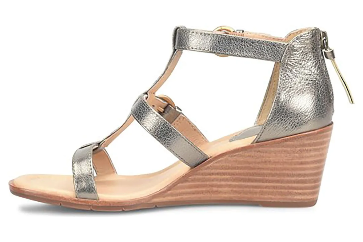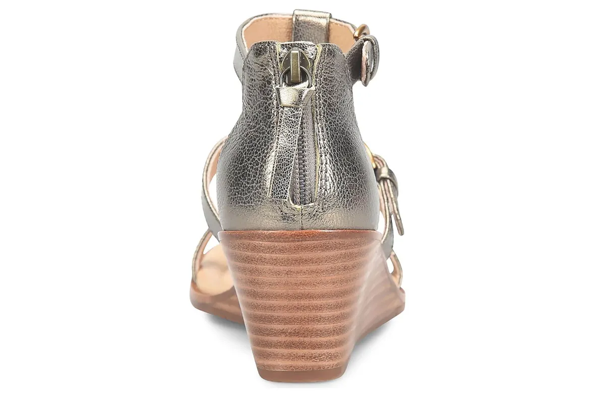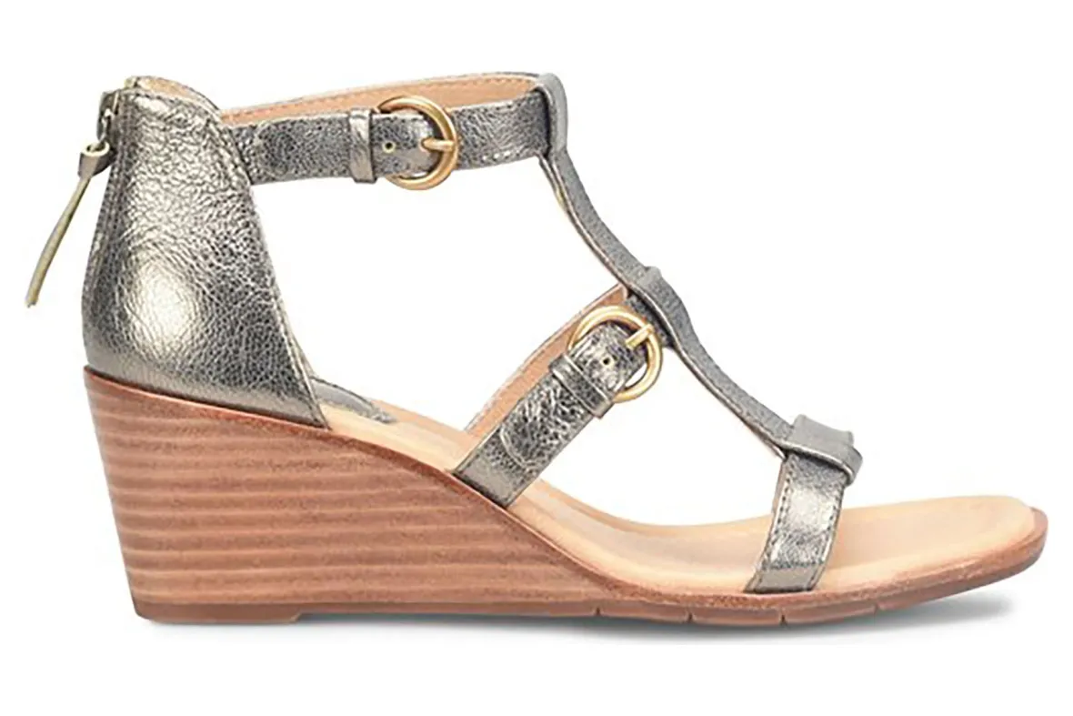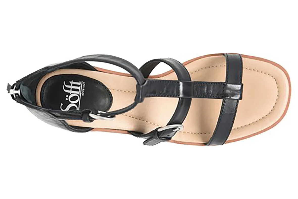 Sofft Gaige is a sophisticated gladiator-inspired sandal. These warm weather shoes have leather uppers, adjustable buckles, back zipper and TPR outsole. A leather-lined footbed provides added comfort, while a 2 ½ inch stacked heel wedge offers elevated style.
