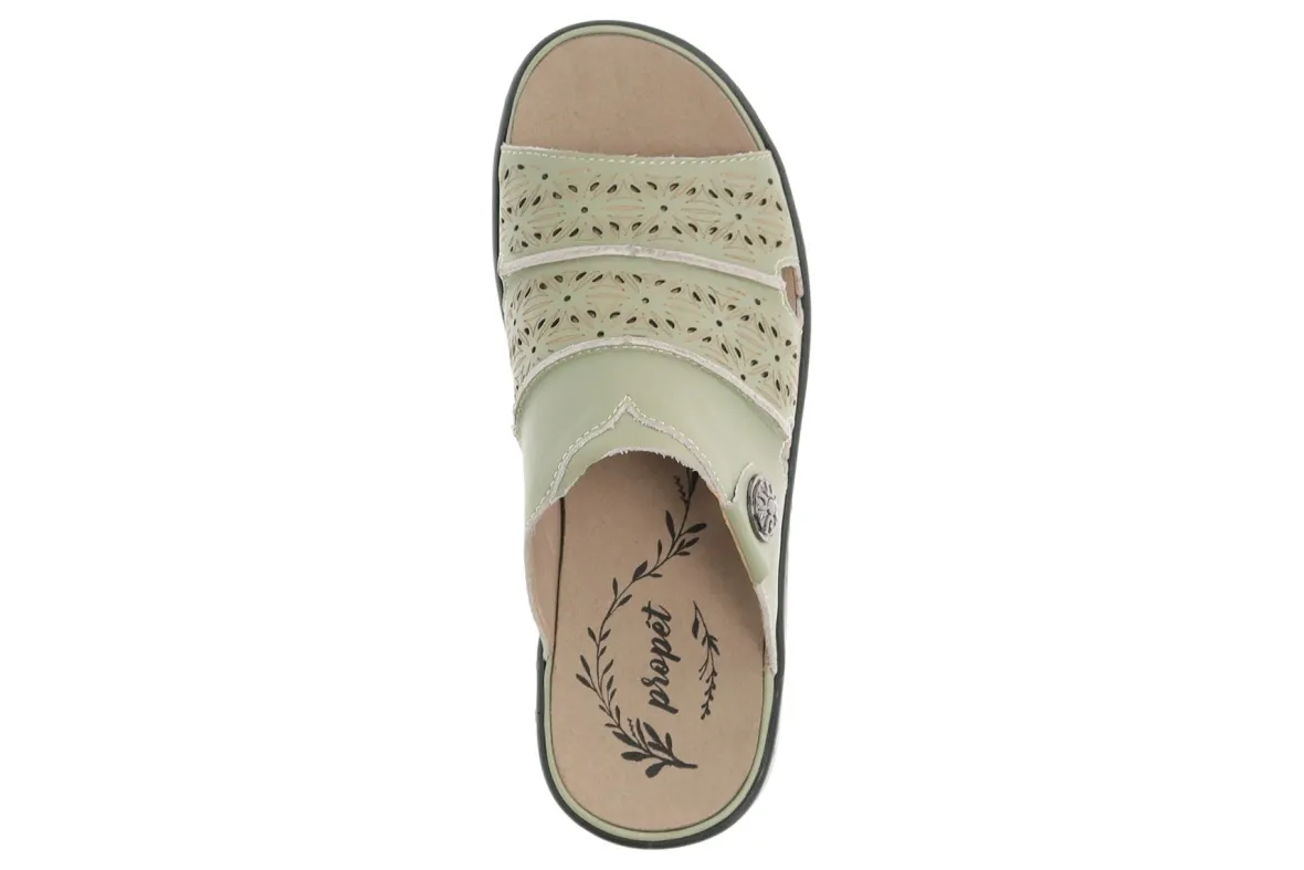 Slide right into comfort with the Gertie and its supple leather upper plus a removable footbed for custom orthotics. Slide sandal with laser cut detailing and medallion embellishment.