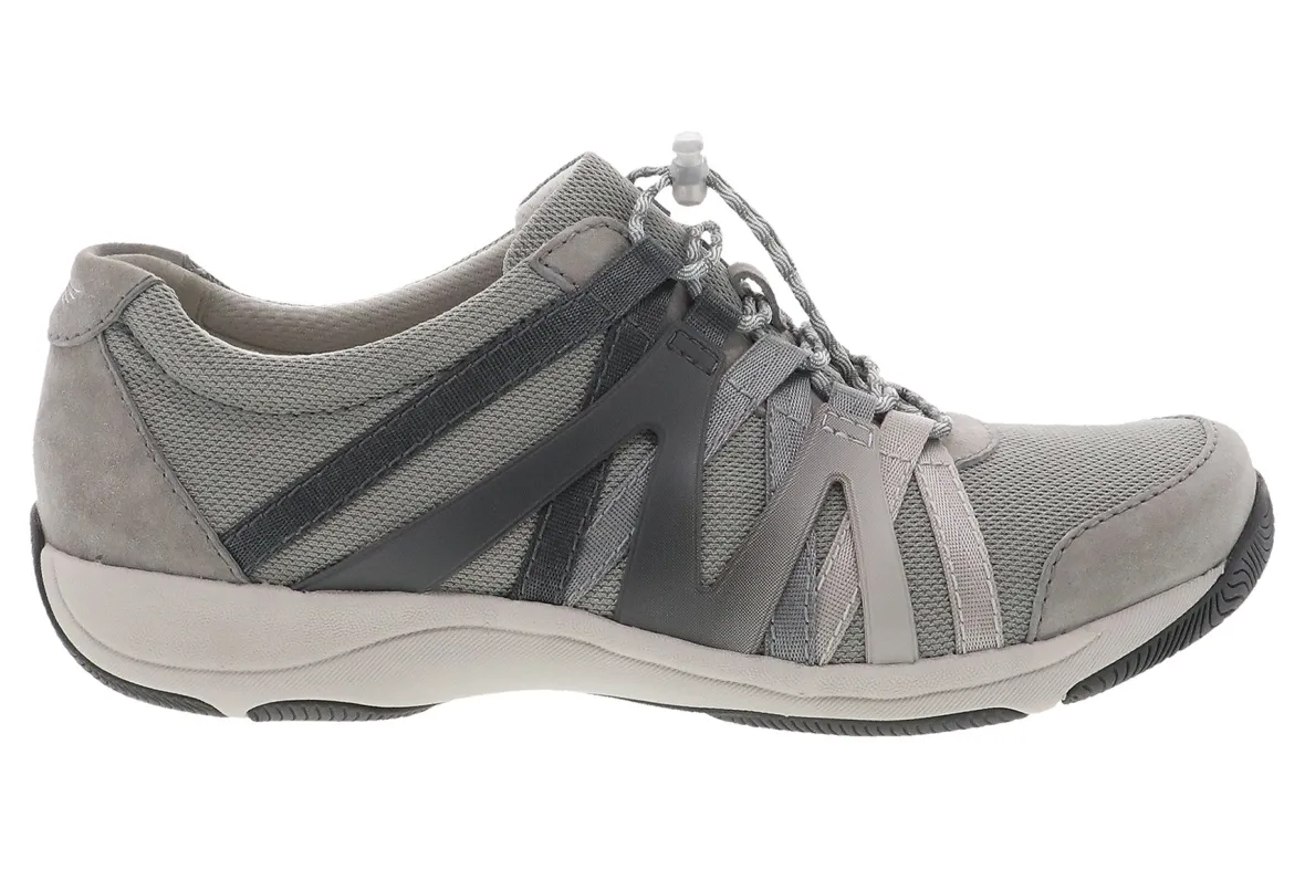 Dansko Henriette is a sporty and sleek comfort sneaker. These active shoes feature a suede and recycled nylon upper, removable EVA footbed and rubber outsole. Adjustable bungee laces, a cooling sock lining and strobel construction provides support and flexibility.
