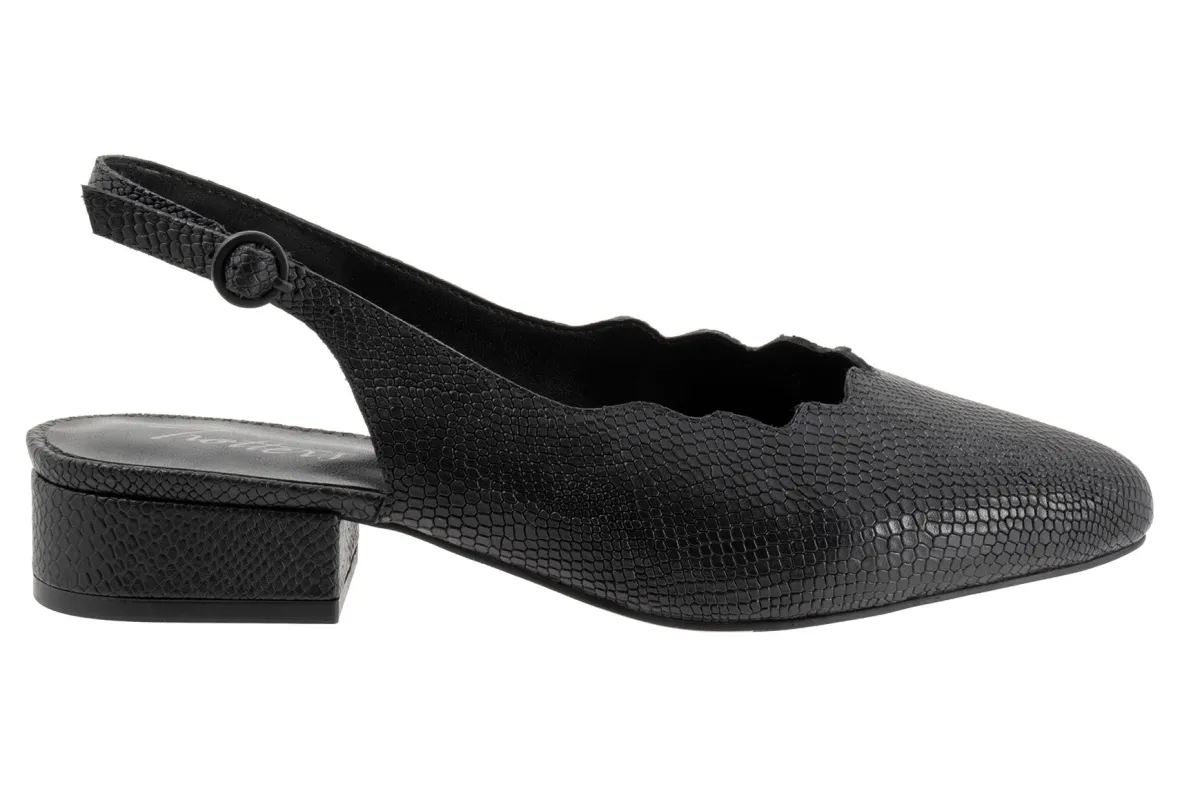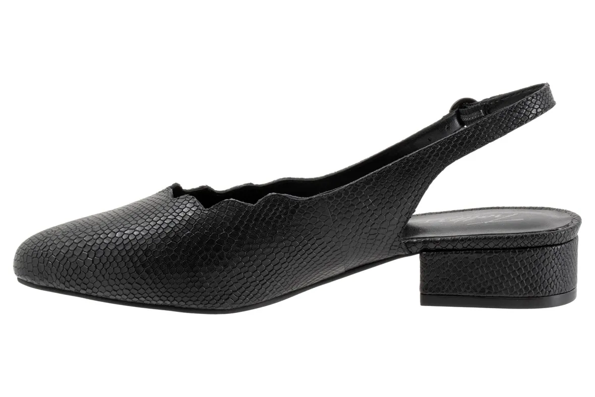 Trotters Joselyn is a classy slingback heel built for comfort. These impressive dress heels have leather uppers, slingback strap closure and rubberized outsole. A memory foam cushioned footbed, scalloped topline and a 1-inch stacked heel height elevates these sleek heels.