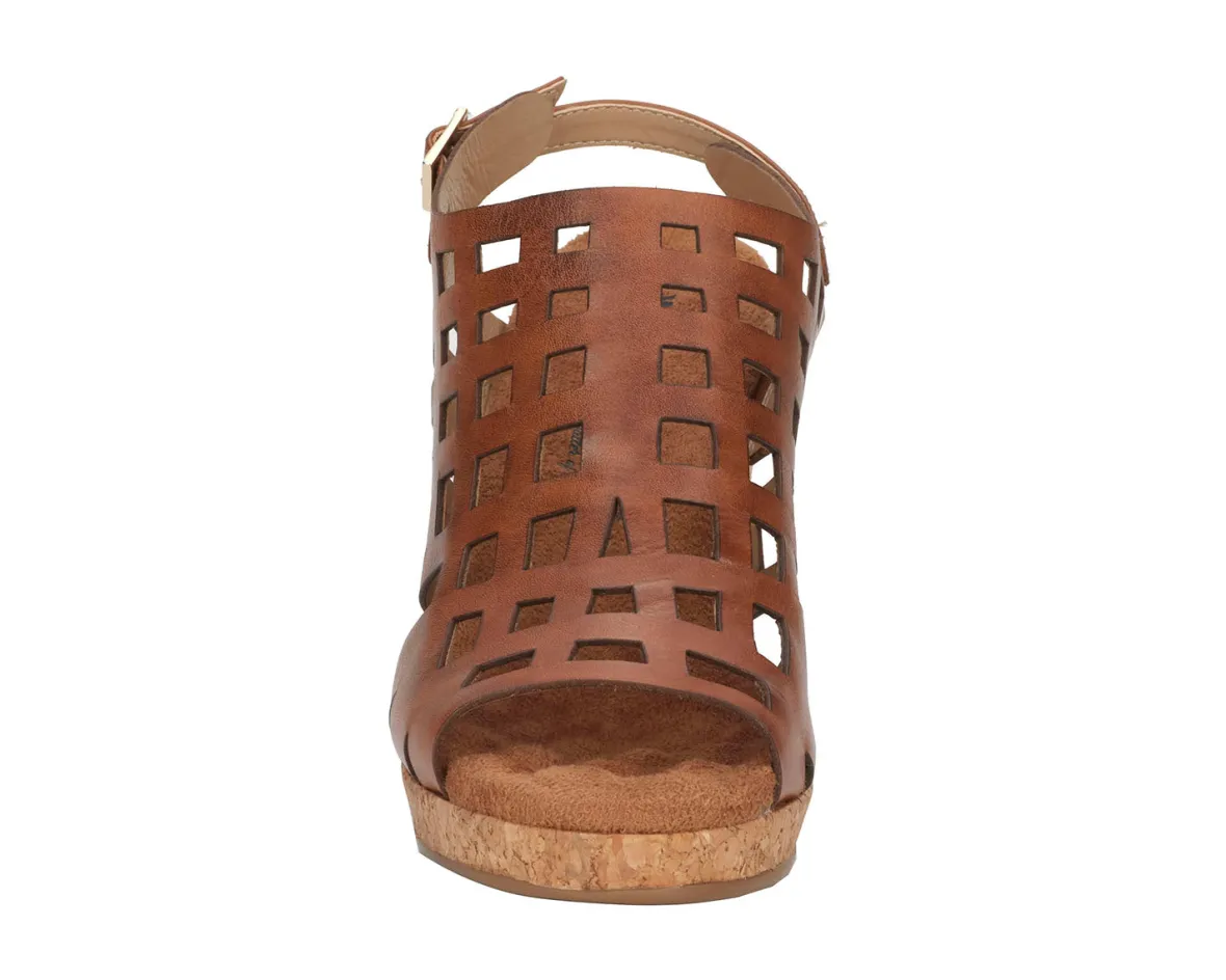 Ros Hommerson Kennedy is a sophisticated wedge sandal. These elevated 3.5-inch heels have cutout leather uppers, an adjustable heel strap, a cushioned footbed and a PU outsole.