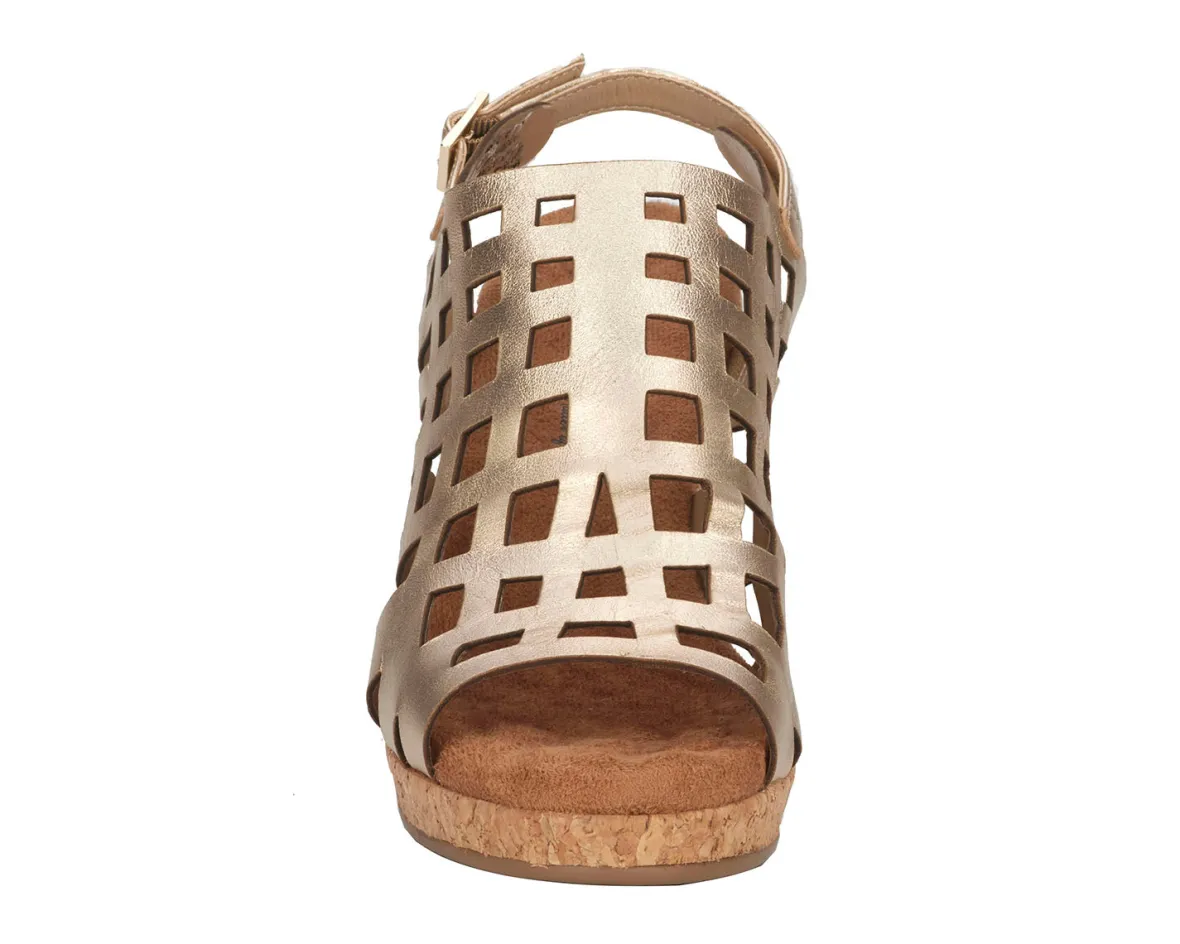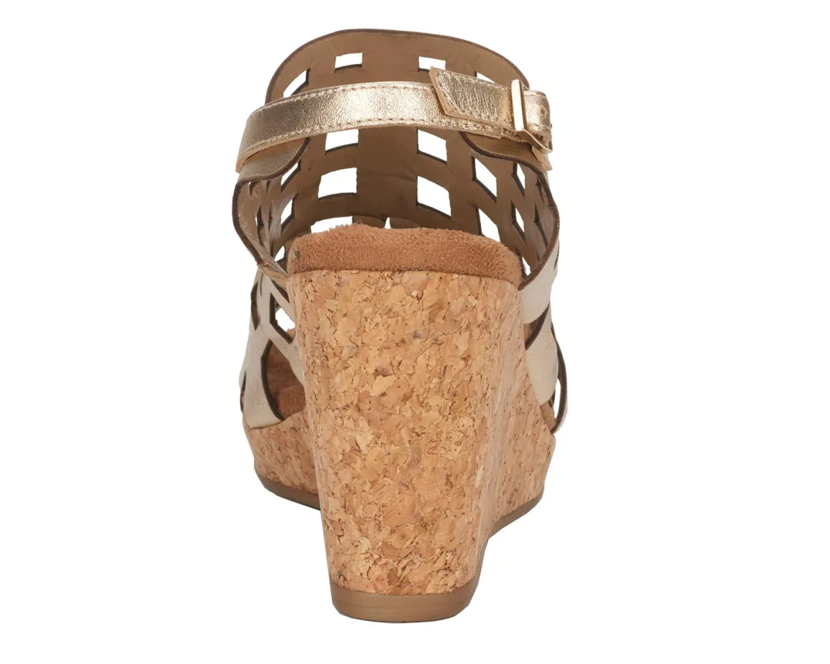 Ros Hommerson Kennedy is a sophisticated wedge sandal. These elevated 3.5-inch heels have cutout leather uppers, an adjustable heel strap, a cushioned footbed and a PU outsole.