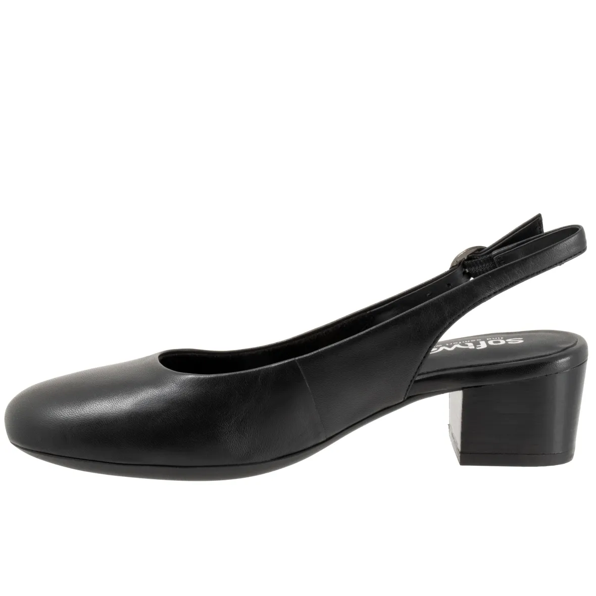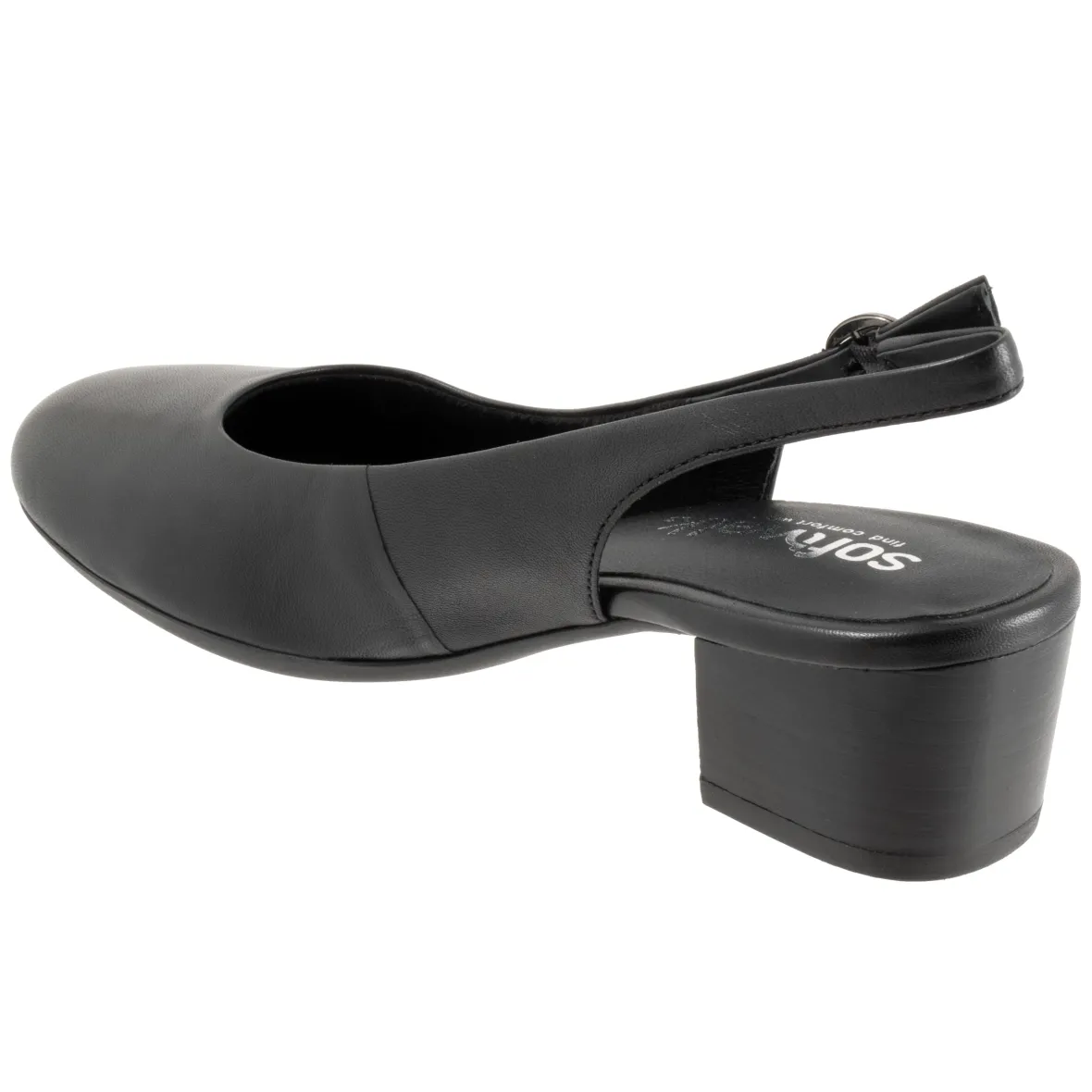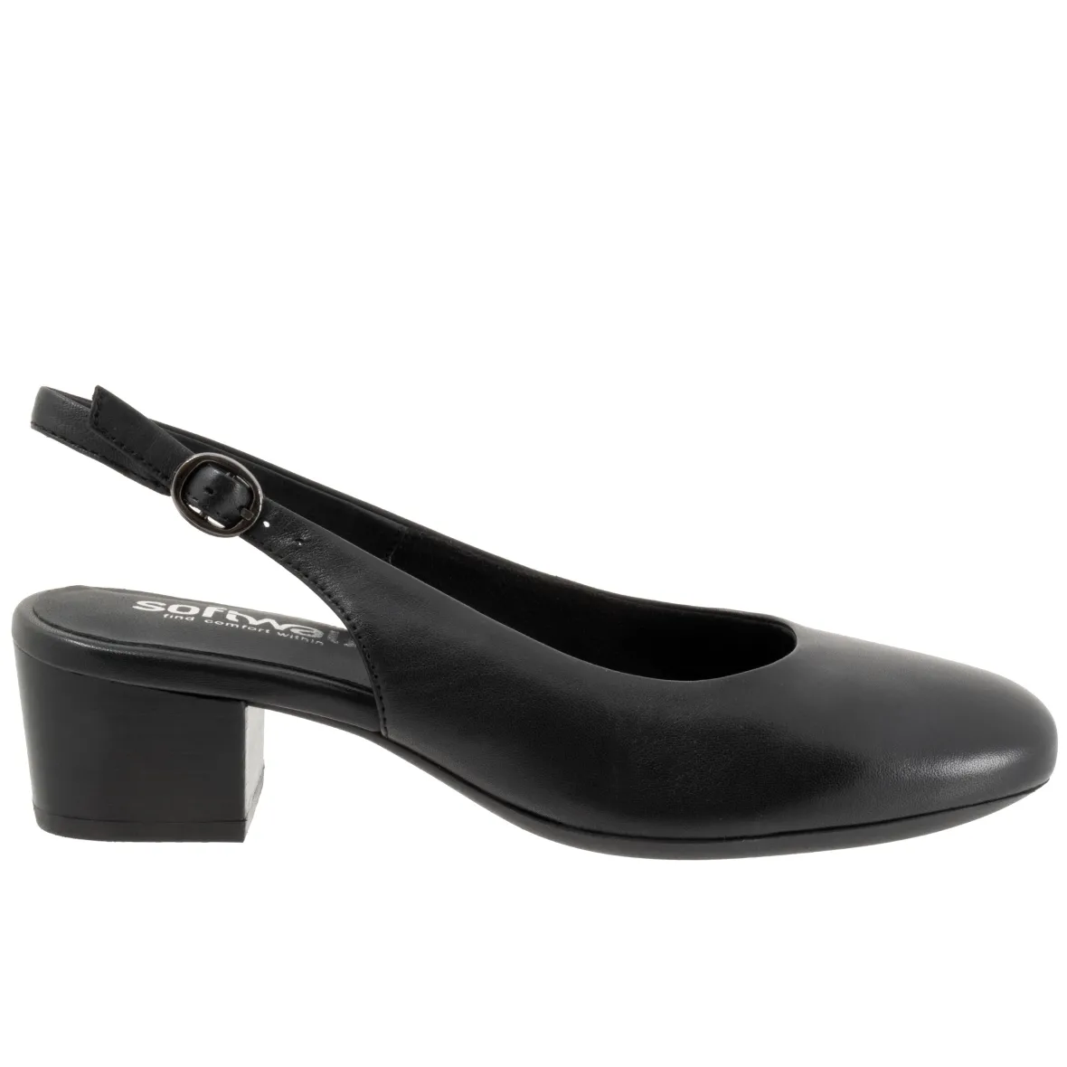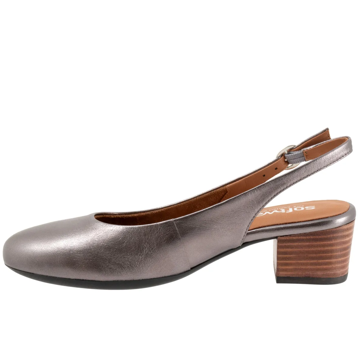 Largo is a casual sling pump with a comfortable-height stacked heel. The rubberized sole is flexible and the footbed is lined in leather.