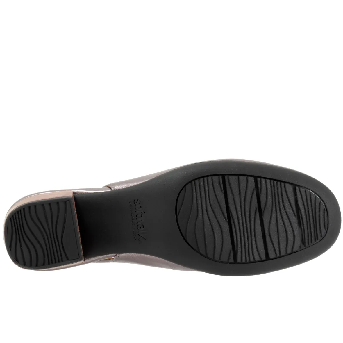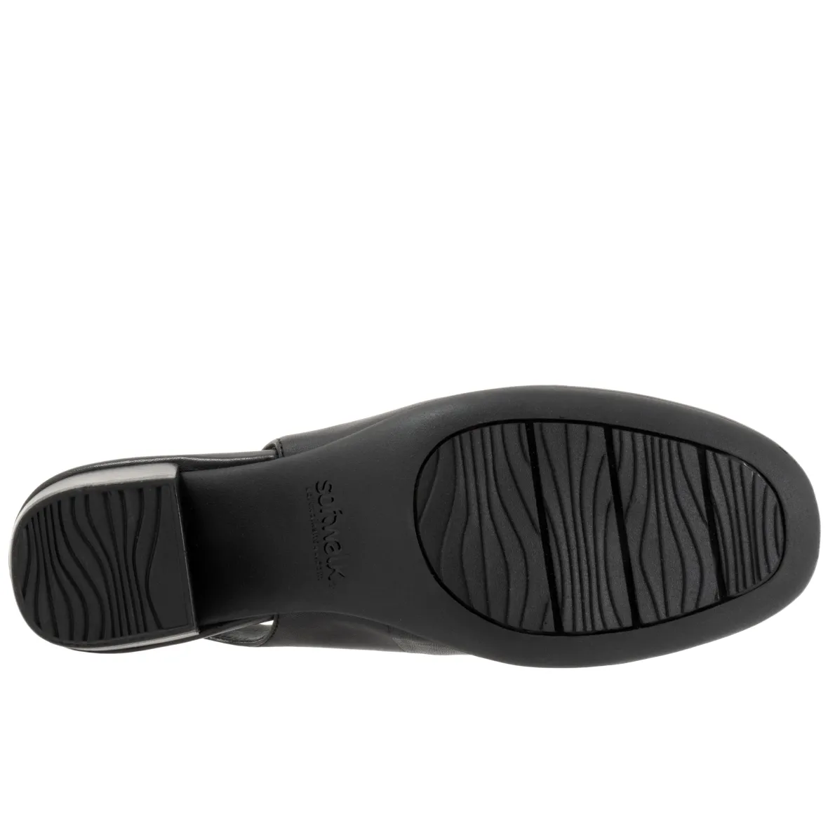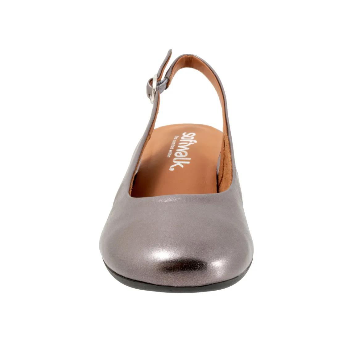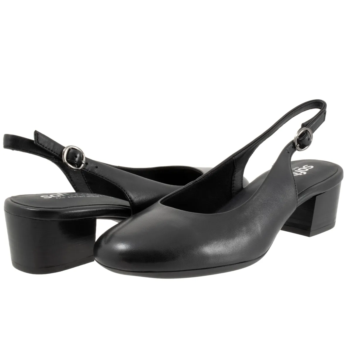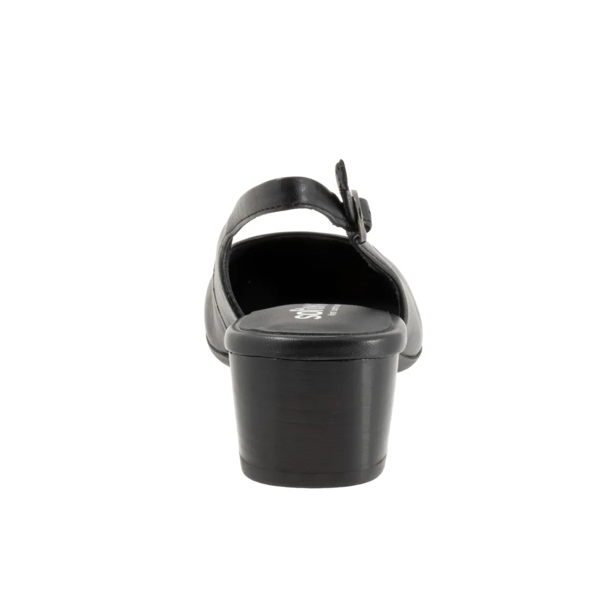 Largo is a casual sling pump with a comfortable-height stacked heel. The rubberized sole is flexible and the footbed is lined in leather.