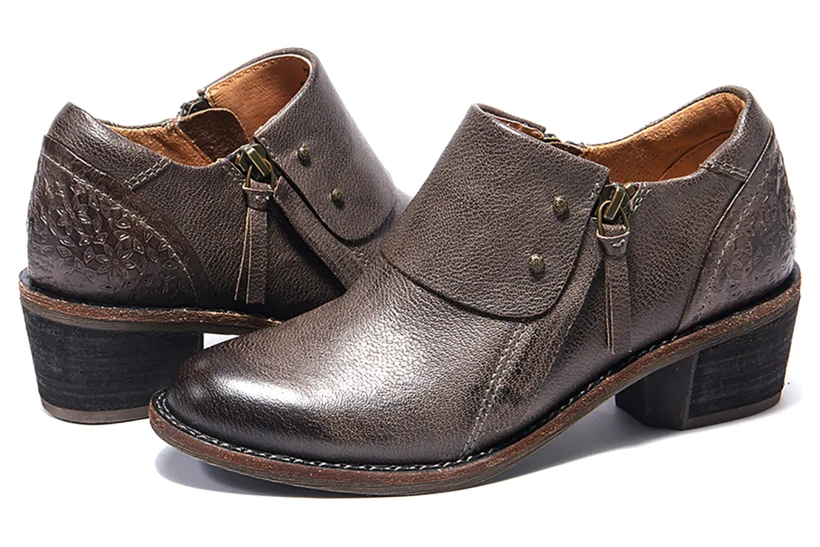 Halsa Footwear Michelle is a fashionable women’s boot. Features include a leather upper with metallic studs, zippered side closure and flexible rubber outsole. A closed almond toe, block heel and removable cushioned insole outlines these chic ankle boots.