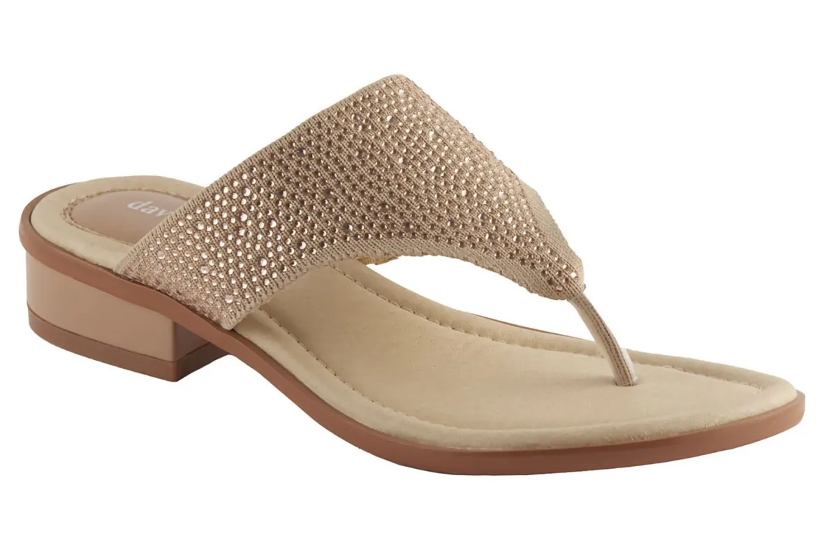 David Tate Perlata is a sleek toe post heel sandal. These warm weather shoes have textile uppers with rhinestones, block heel silhouette and rubber outsole. A foam padded and leather-covered footbed, plastic-covered toe post and 1-inch heel height elevates these trendy heels.