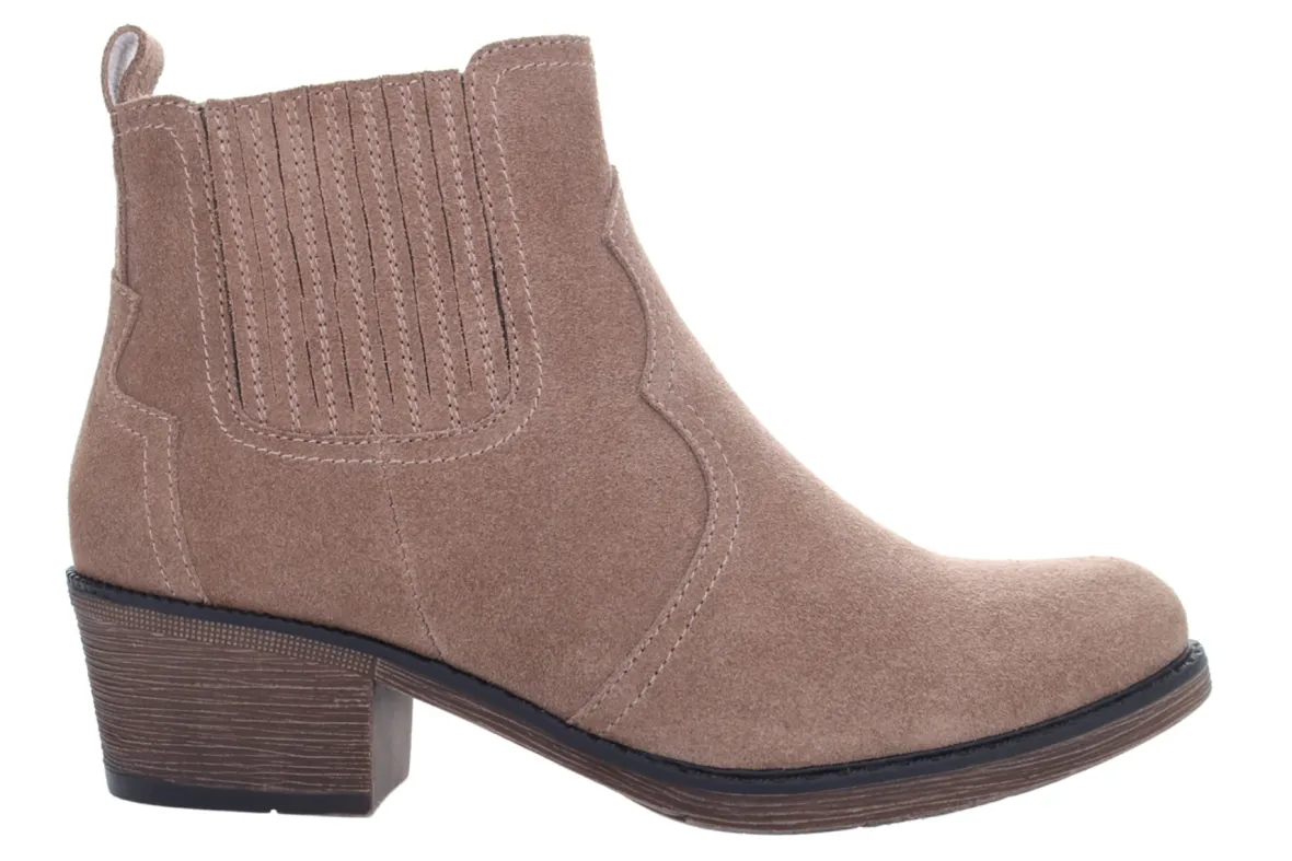 Suede upper with traditional western styling and hidden side goring for a comfortable fit, cushioning rubber with mesh lining.