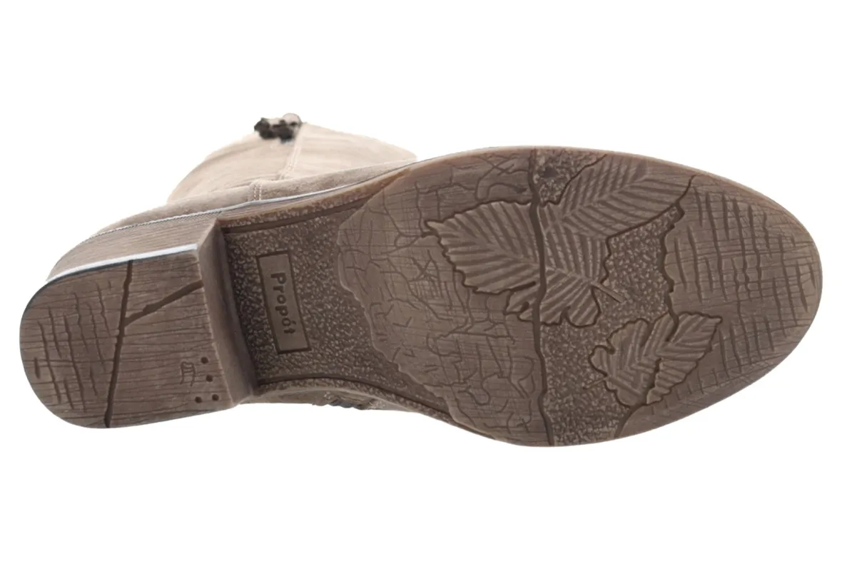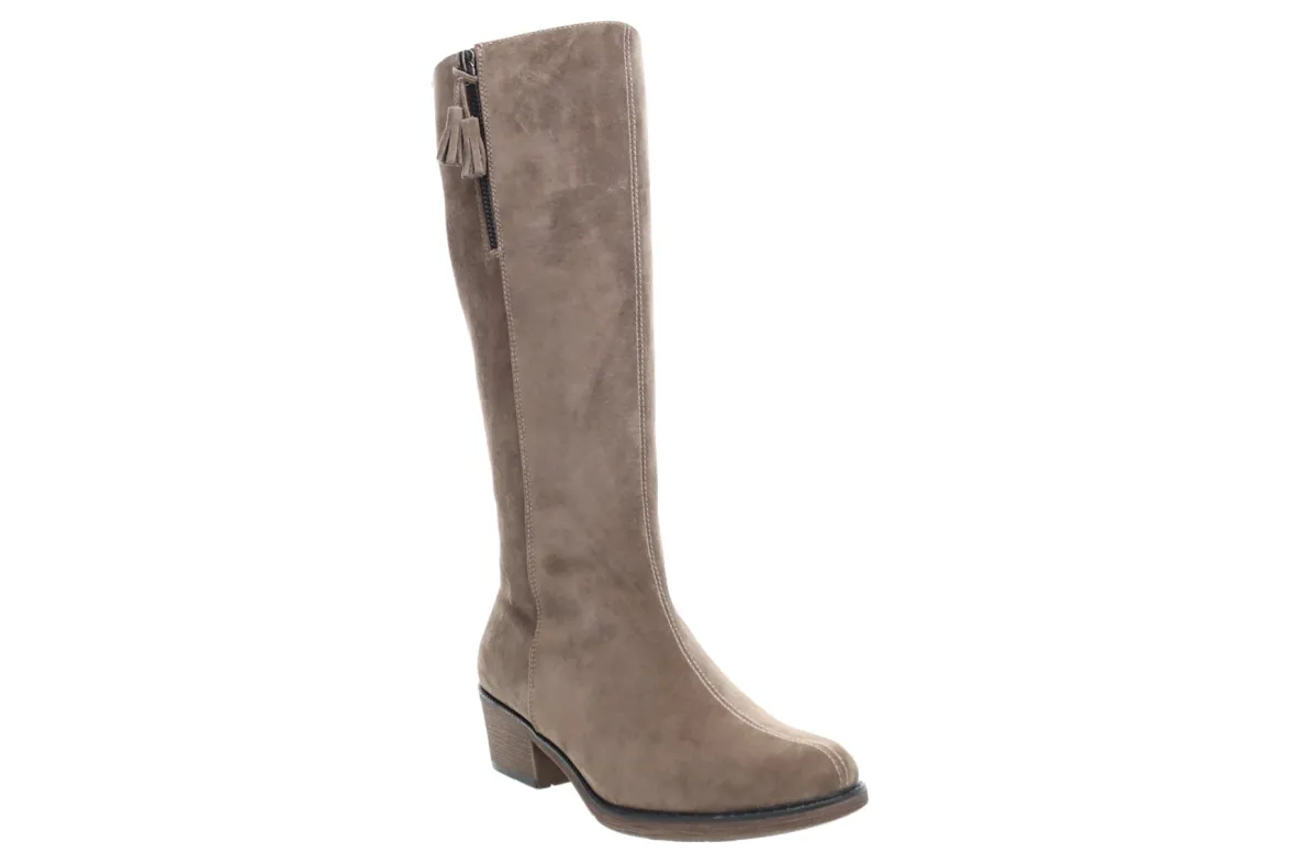 Tall shaft suede boot with inside zip and hidden goring plus decorative tassel.