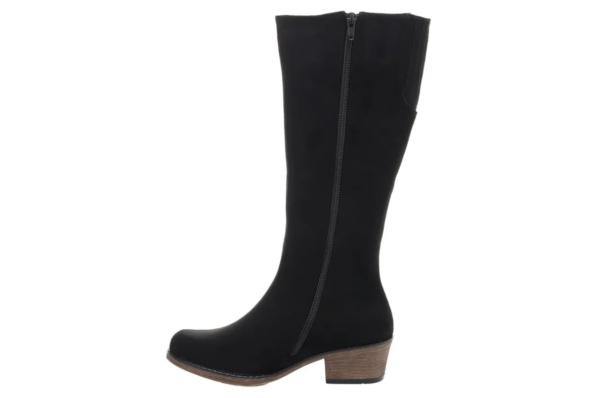 Tall shaft suede boot with inside zip and hidden goring plus decorative tassel.