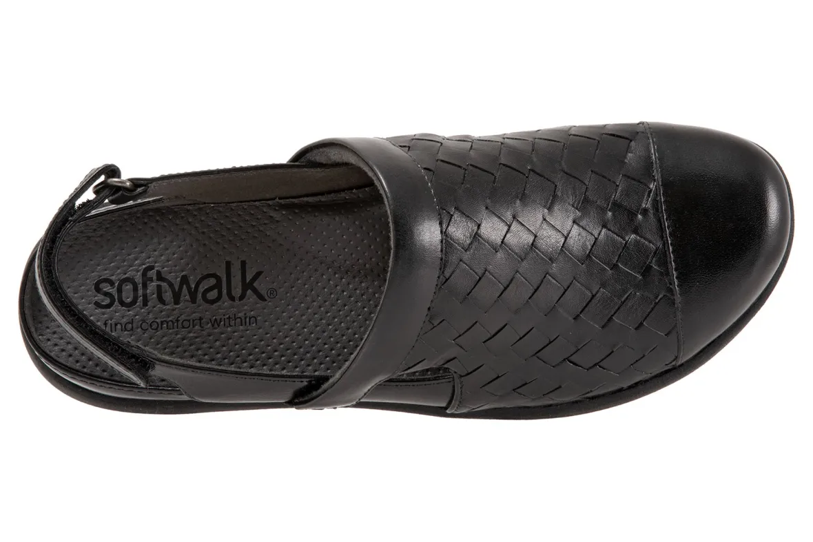 Softwalk Salina Woven II is a detailed slingback shoe. Prominent features include a woven leather upper, removable cushi…