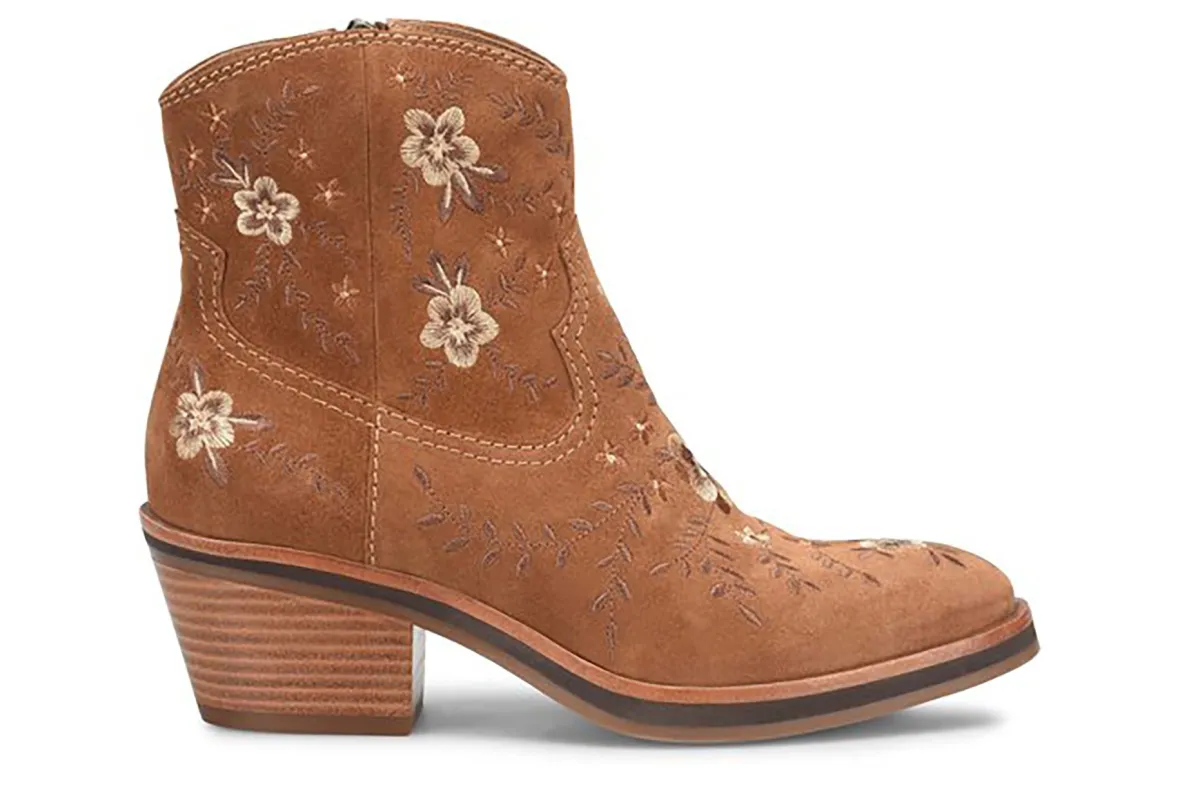 A new take on a classic western silhouette makes a statement with bold EVA striped outsole combined with a casual snip toe and low undercut heel. Artisanal floral embroidery pops on western-inspired Sofft Sophie boot, detailed in premium Italian leathers and suede.