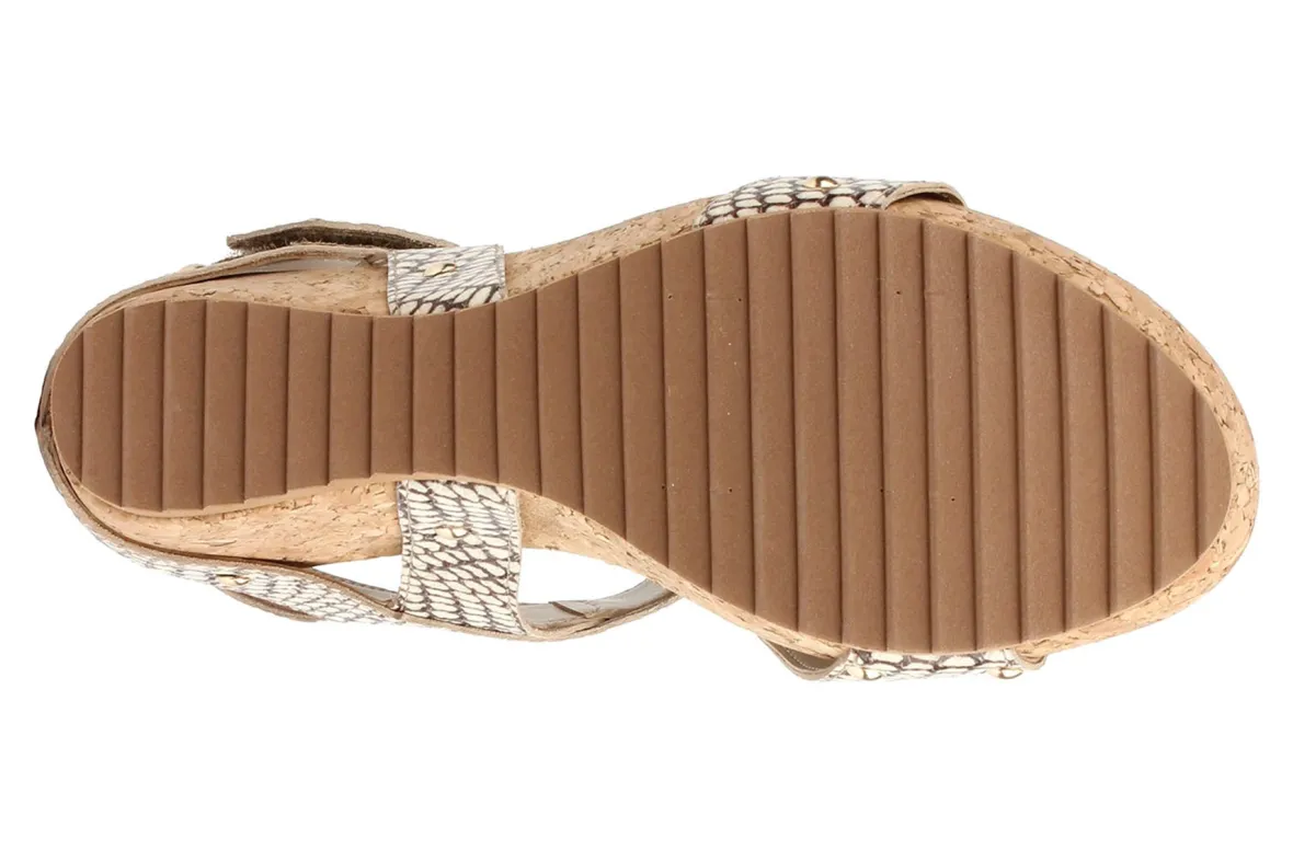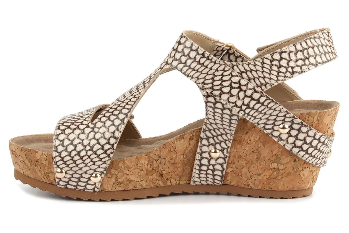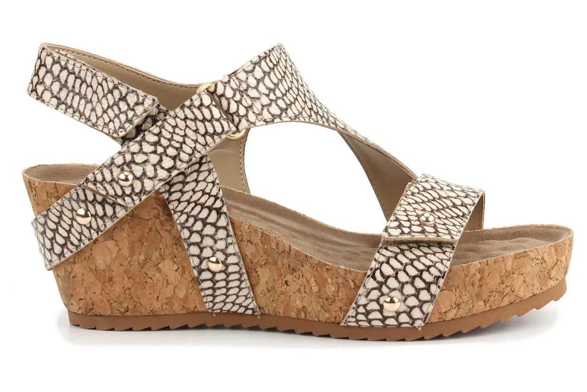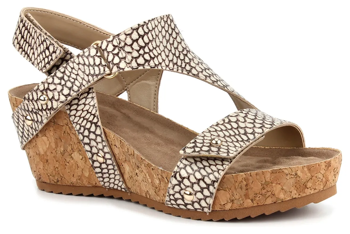Ros gives you complete adjustability is with Traci. Three leather straps are secured with hidden hook and loop closures. Lovely nail heads accentuate the leather straps where they wrap over the cork covered wedge heel. Cushioned Tiny Pillows insoles within the contoured footbed provides extreme comfort , making Traci your go-to summer sandal!