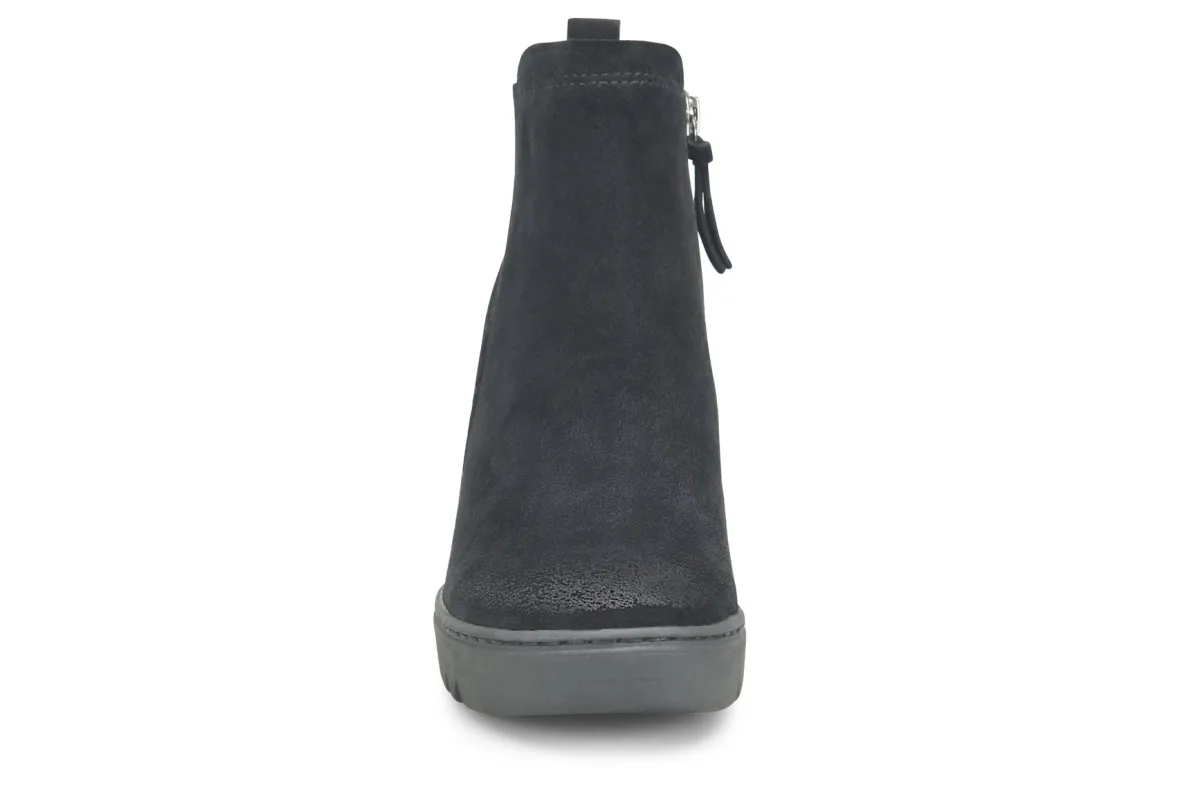 Sofft Utley is a durable and comfy women’s boot. These sturdy cold weather booties have waterproof suede uppers, an inside zipper and non-slip lugged TPR outsole. Other features include a microfiber lining, stretch goring, cushioned footbed and 3 ¼ inch stacked wedge heel height.