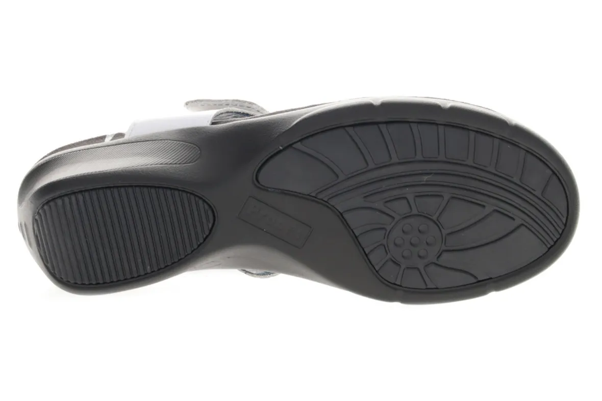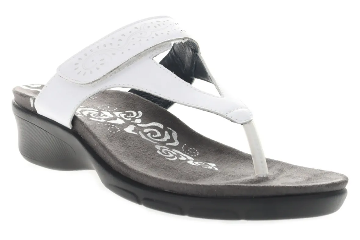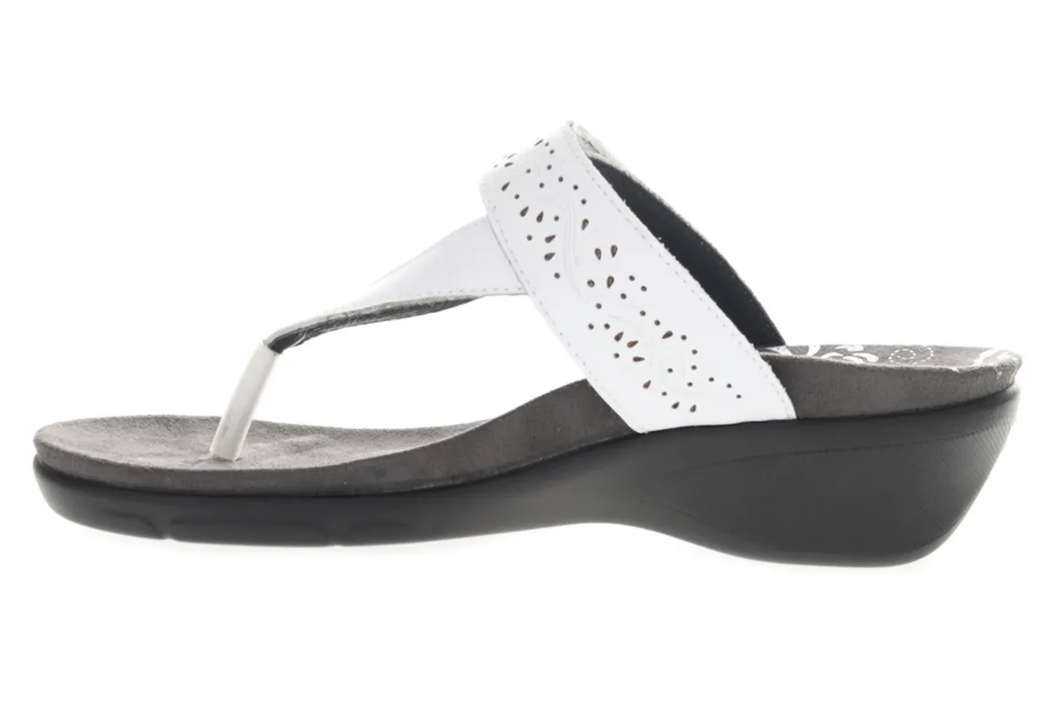 Dressy flip flop with laser cut detailing on the adjustable leather strap. Micro-fiber lined Open cell foam footbed. PU outsole absorbs shock to reduce fatigue with rubber tread inserts for traction.