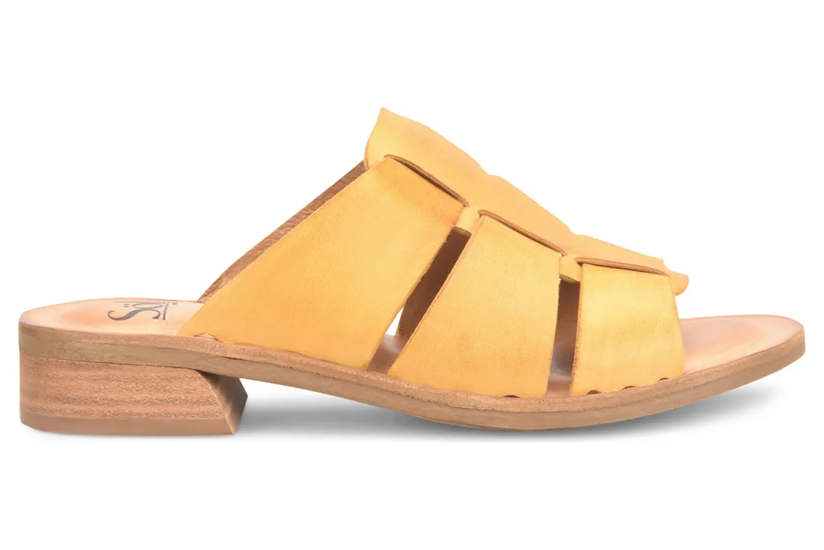 Sofft Almeda is an updated fisherman sandal built for comfort. These warm weather shoes have full-grain or distressed leather uppers and a sturdy TPR outsole. A leather-lined footbed with raised foam and a 1 ¼ inch stacked heel elevates these chic summer sandals.