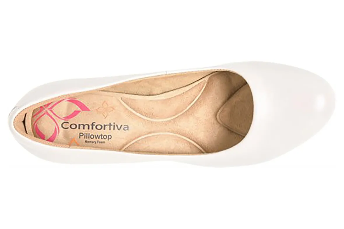 Comfortiva Amora is a chic and comfortable dress pump. The Comfortiva Amora features a memory foam footbed and heel counter, flexible outsole and 2 inch heel height perfect for any special occasion. The lightweight and flexible stacked heel adds height without compromising comfort.