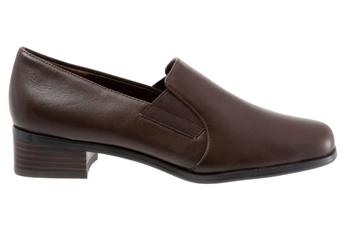 Trotters Ash is a comfortable and stylish slip-on loafer. These chic dress shoes have leather uppers, a PU footbed lining, dual goring and rubber outsole. A breathable tricot fabric upper lining, comfortable toe shape and 1 ¼ inch stacked heel height makes these loafers stand out.