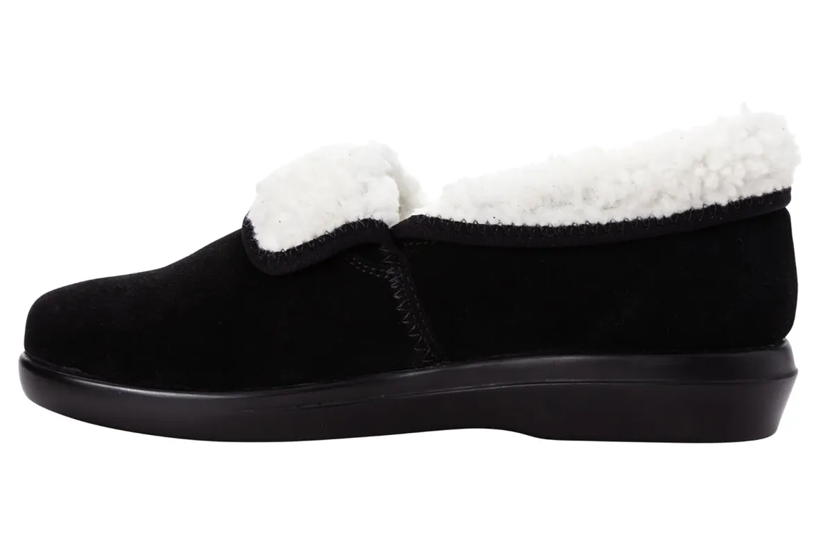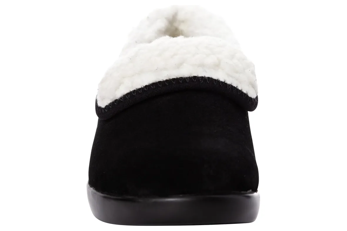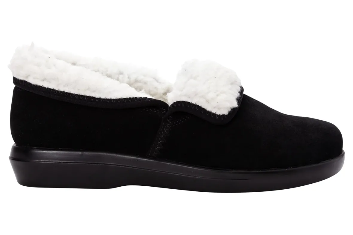 Propet Colbie is a warm and roomy slipper. Features include a suede upper with faux fur lining, slip-on construction, removable footbed and PU outsole. A high density PU foam ensures a cooler footbed, while the warm faux fur trim keeps feet warm during cold weather days.