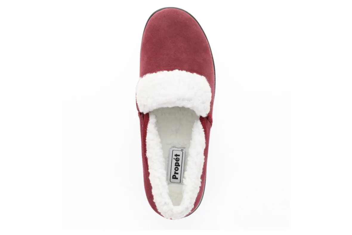 Propet Colbie is a warm and roomy slipper. Features include a suede upper with faux fur lining, slip-on construction, removable footbed and PU outsole. A high density PU foam ensures a cooler footbed, while the warm faux fur trim keeps feet warm during cold weather days.