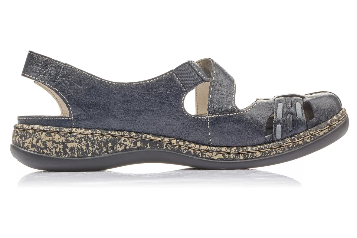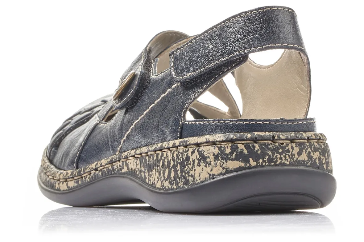 For ladies who are looking forcomfortwhen choosing their shoes and do not want to miss out on a fashionable look, Rieker offers this beautiful women’s slip-on shoein dark blue in its spring / summer collection. Theleatherupper has two openings in the toe area, decorated with a nice cross strap. The padded insole of the shoe is made of genuine leather. The crossed straps above the instep do not only look pretty, but are also fitted with avelcroclosure respectivelya small elastic band, so that an optimal fit is guaranteed. In the heel area is another velcro closure.