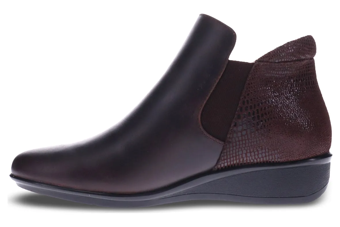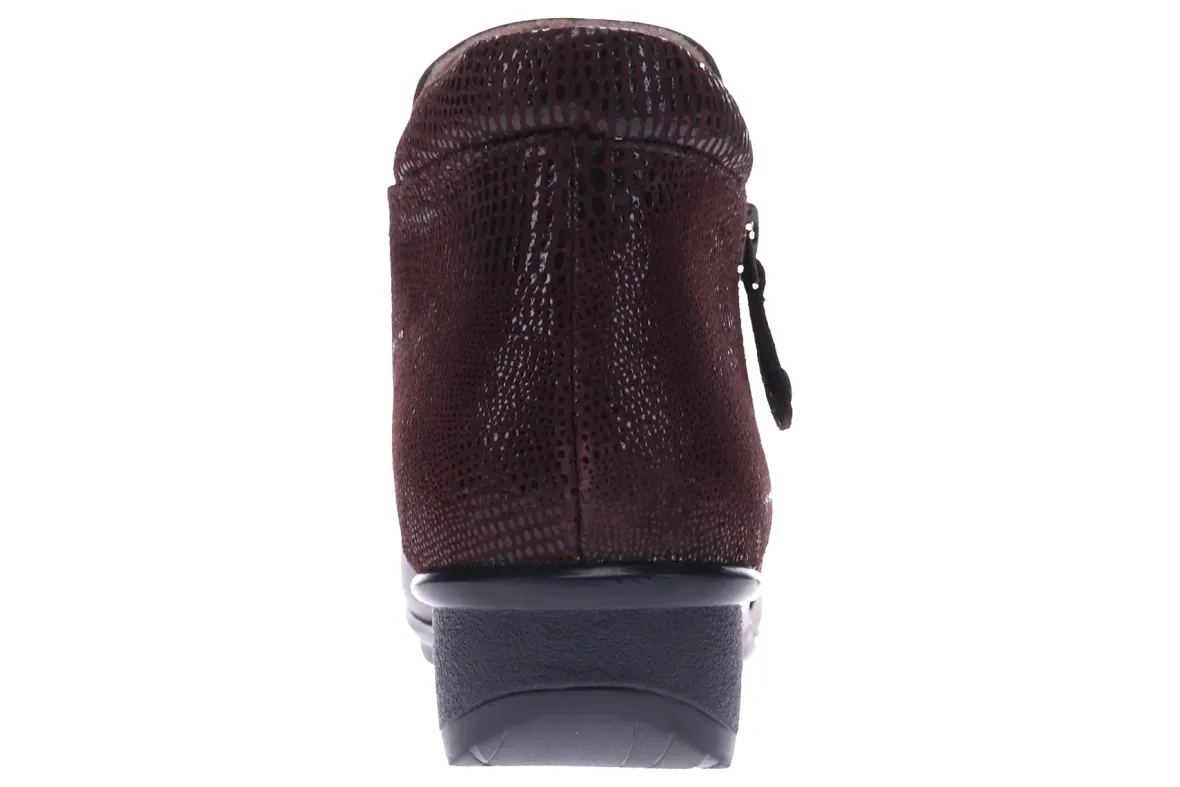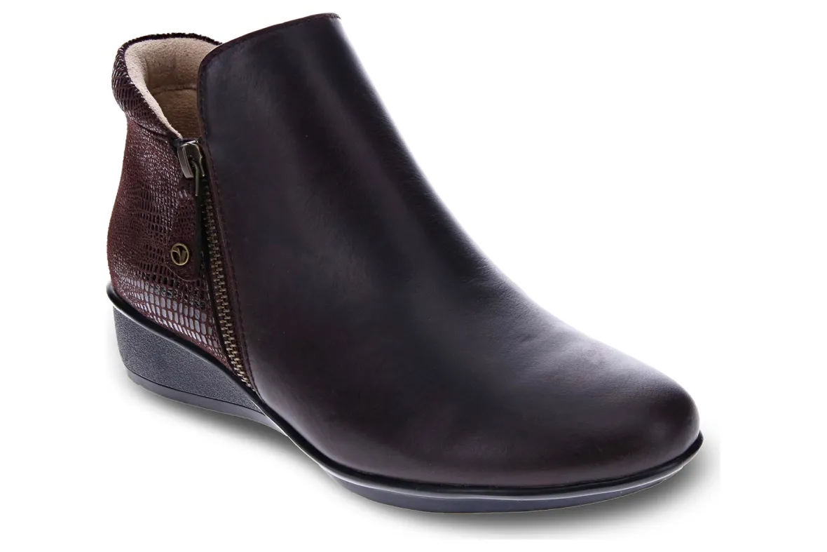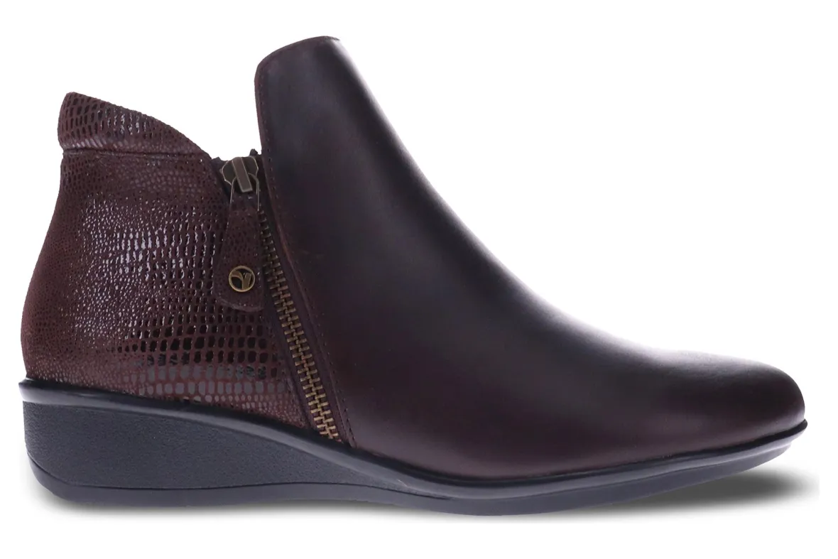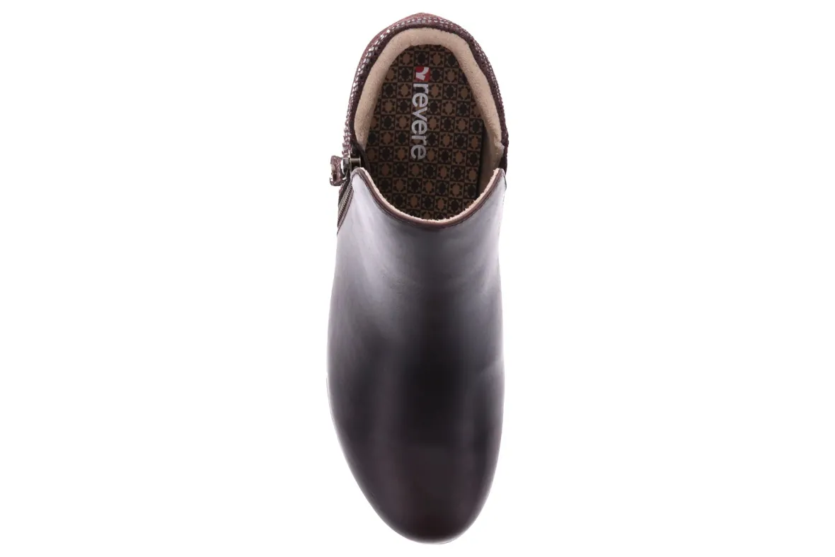 A little bit daring but endlessly wearable, the Revere Damascus leather bootie features an asymmetrical side zip detail on a demi-wedge outsole. Contrasting front and back panels in luscious leather, animal skin prints, and metallic add a hint of shine and texture to this mid-ankle bootie.