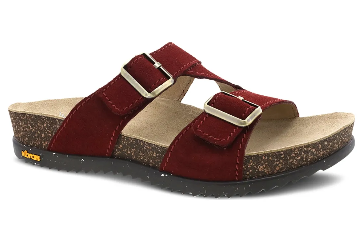 Casual and classic, the Dansko Dayna sandal is a go anywhere and take everywhere style. This double strap slide has hook and loop adjustability to assure the perfect fit. Dayna features chrome-free suede uppers and chrome-free leather linings, a contoured cork and EVA midsole which is lightweight and cushioned for shock absorption, and a Vibram ECOSTEP EVO rubber outsole.