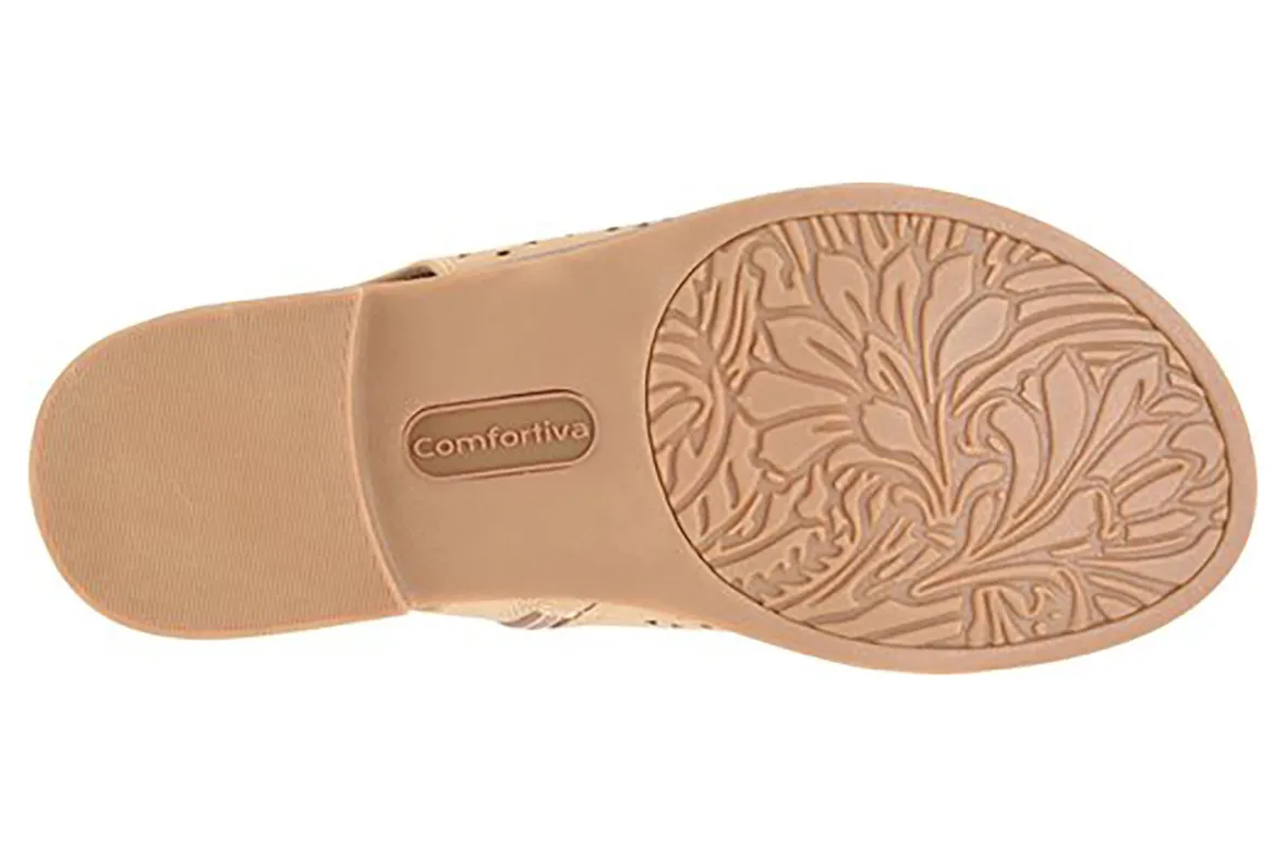 Comfortiva Delsie is a stylish summer sandal built for comfort. Prominent features include perforated leather or suede u…