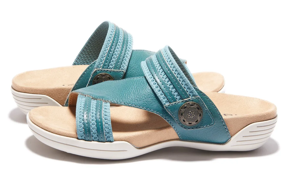 Halsa Footwear Desiree is a fashionable comfort sandal. Features include leather uppers, textile lining, cushioned EVA footbed and rubber and synthetic outsole. A hook and loop closure, lightweight and flexible midsole and metal hardware detailing will make these sandals a new favorite.