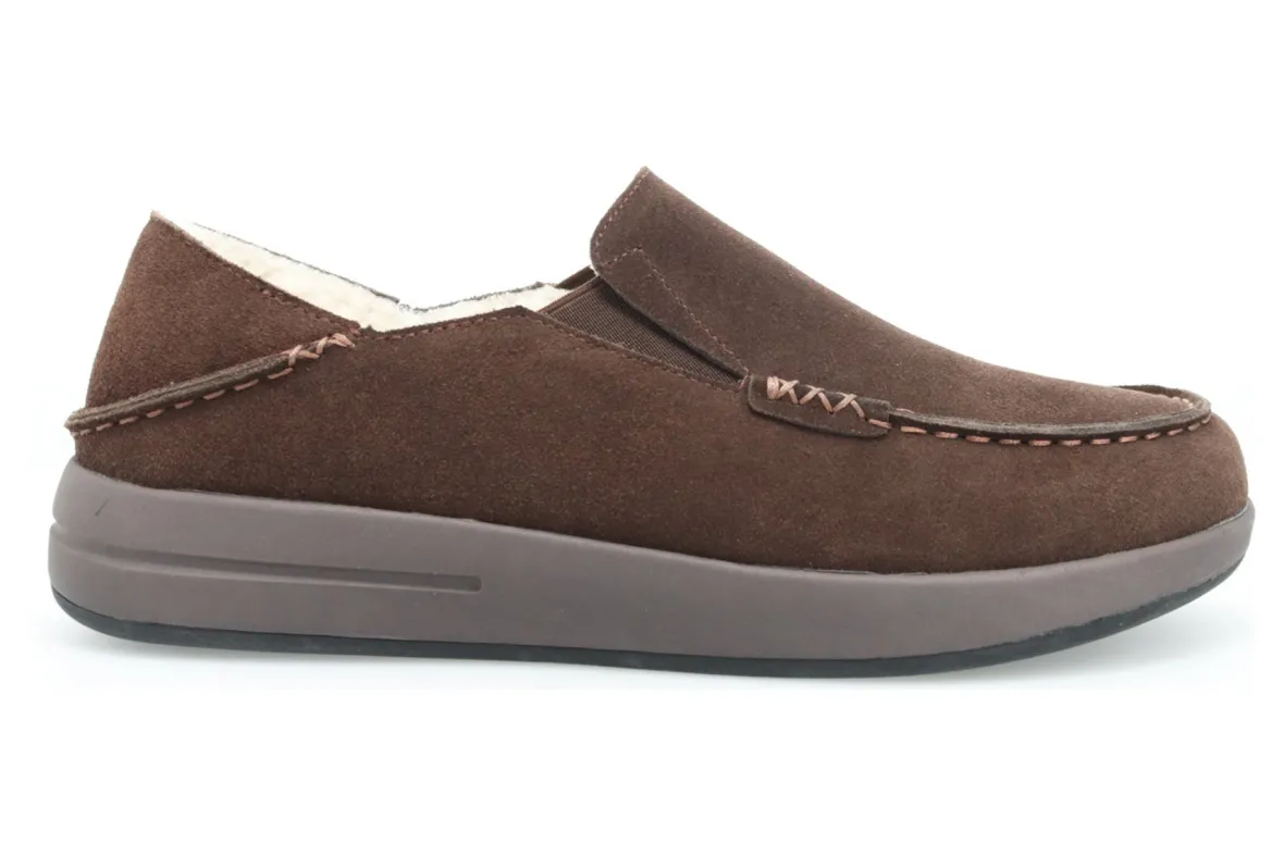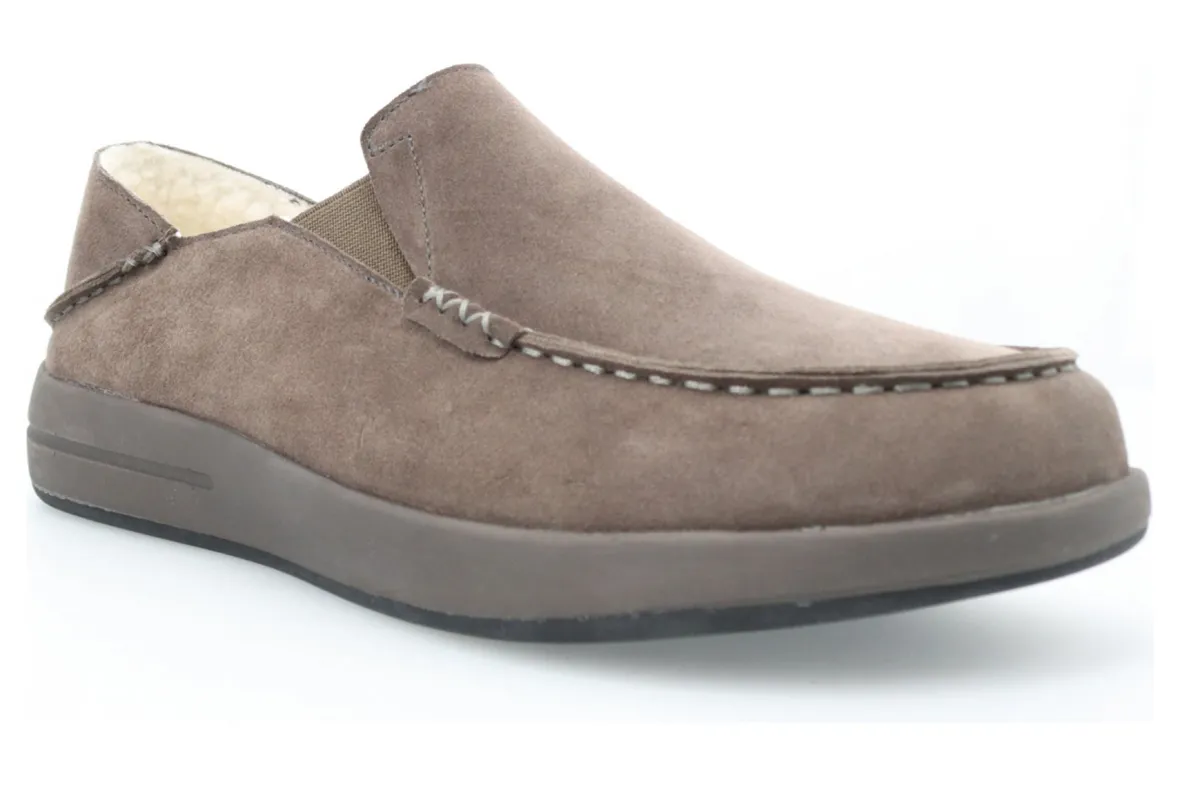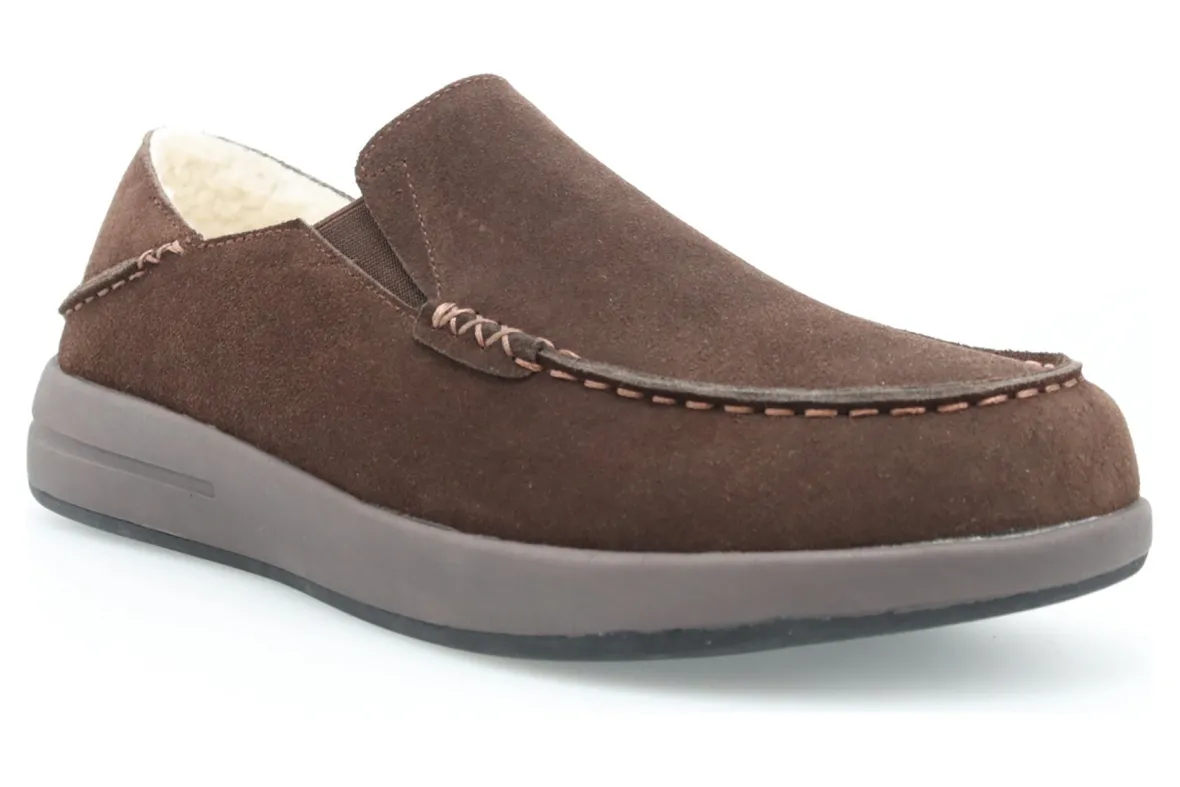 The perfect slipper for slip-on comfort and a rubber outsole for traction on outdoor surfaces Suede upper with fold-down heel counter for slip-onconvenience. Faux shearling lining for warmth.