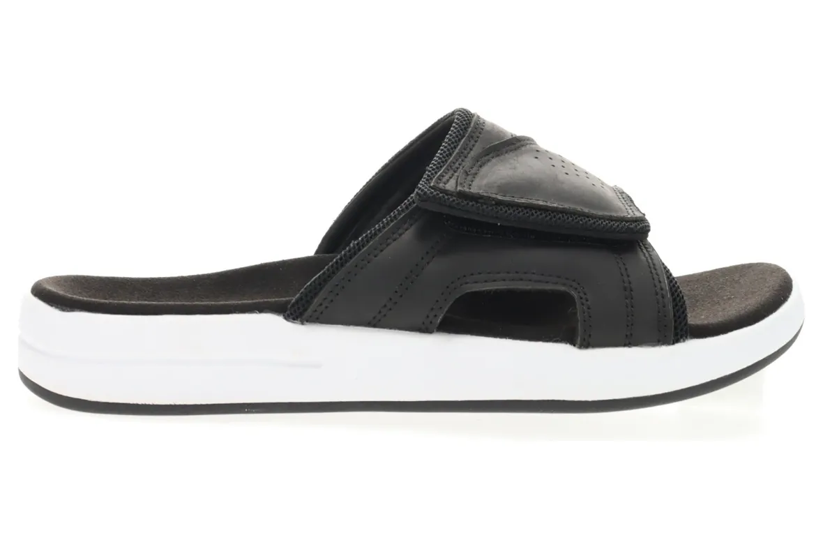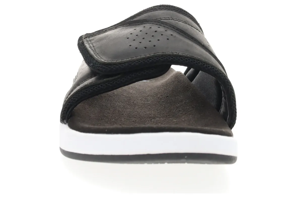 Comfort and style abound in this classic adjustable slide sandal. The perfect comfort sandal features a contoured footbed and sturdy rubber sole for traction on all surfaces. Nubuck slide sandals with wide, padded adjustable hook and loop strap for a great fit.