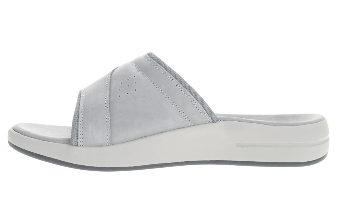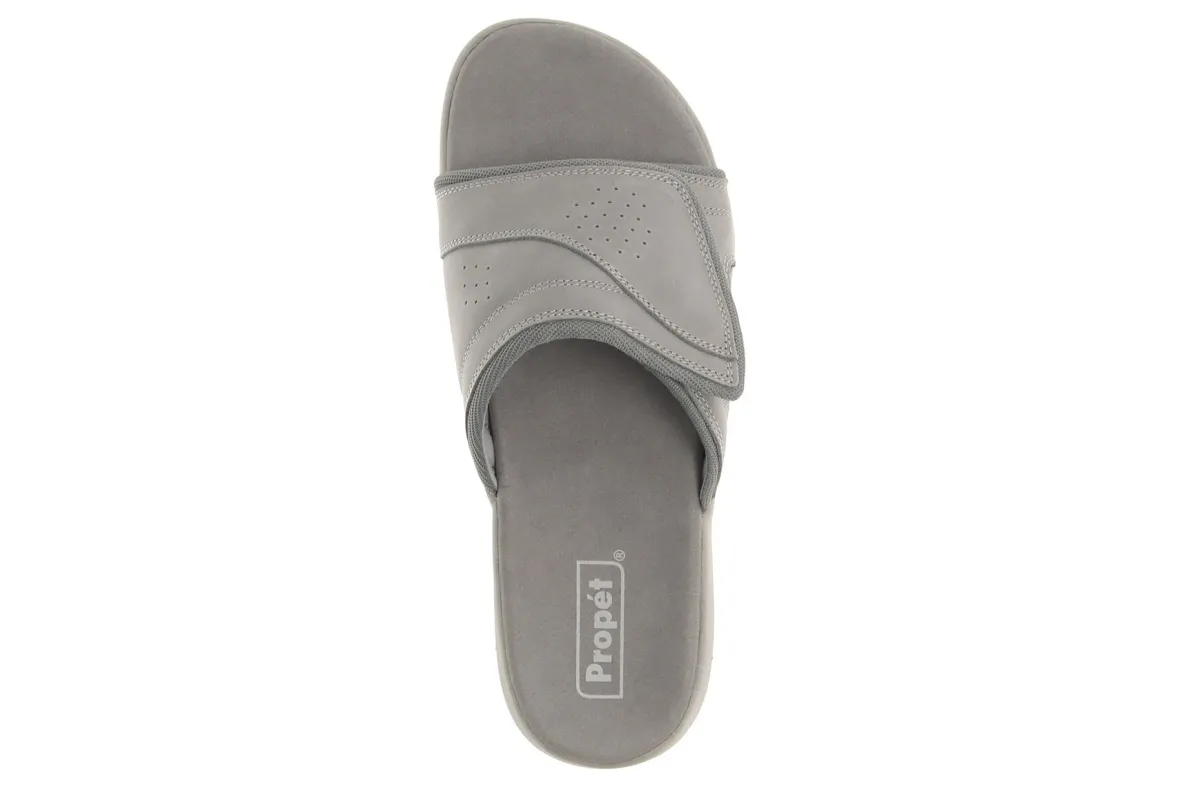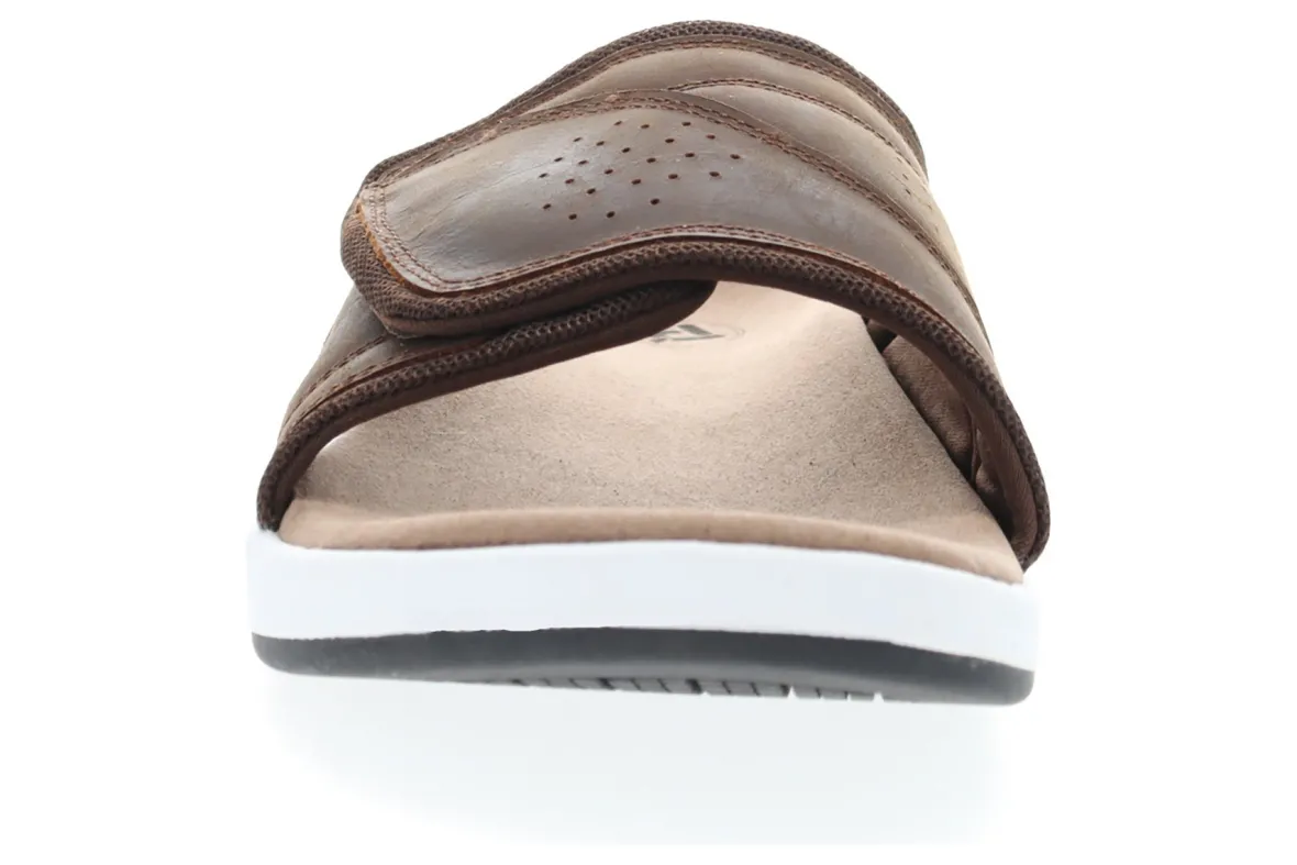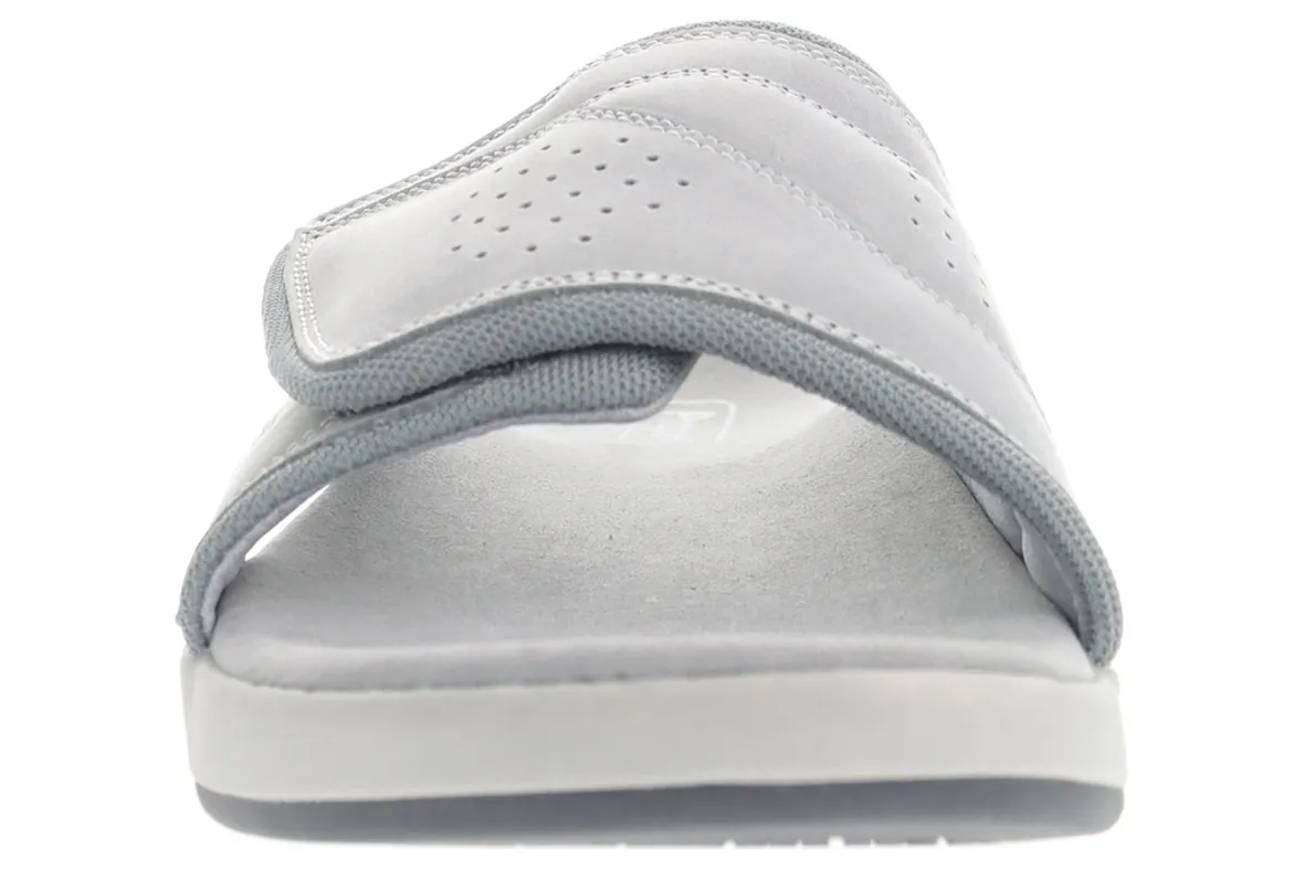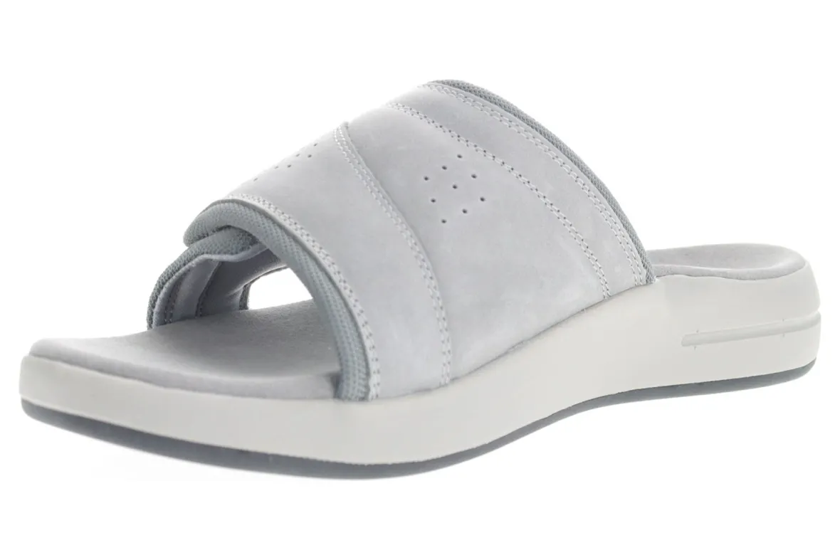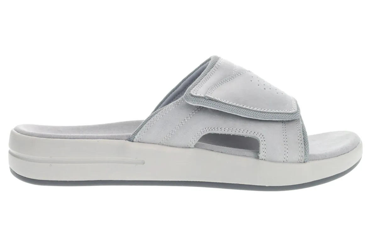Comfort and style abound in this classic adjustable slide sandal. The perfect comfort sandal features a contoured footbed and sturdy rubber sole for traction on all surfaces. Nubuck slide sandals with wide, padded adjustable hook and loop strap for a great fit.
