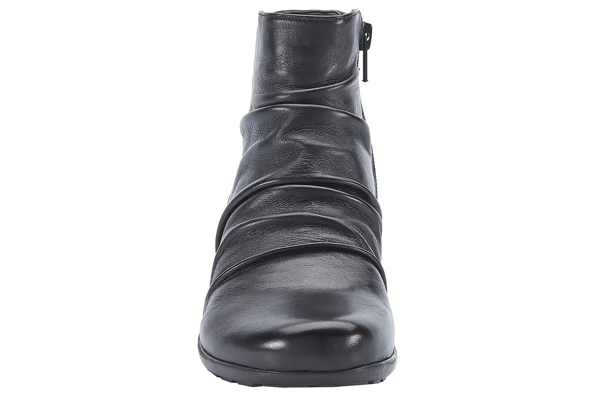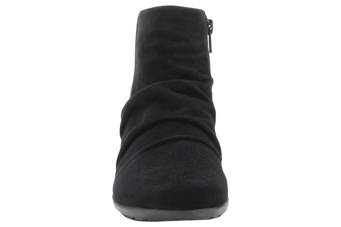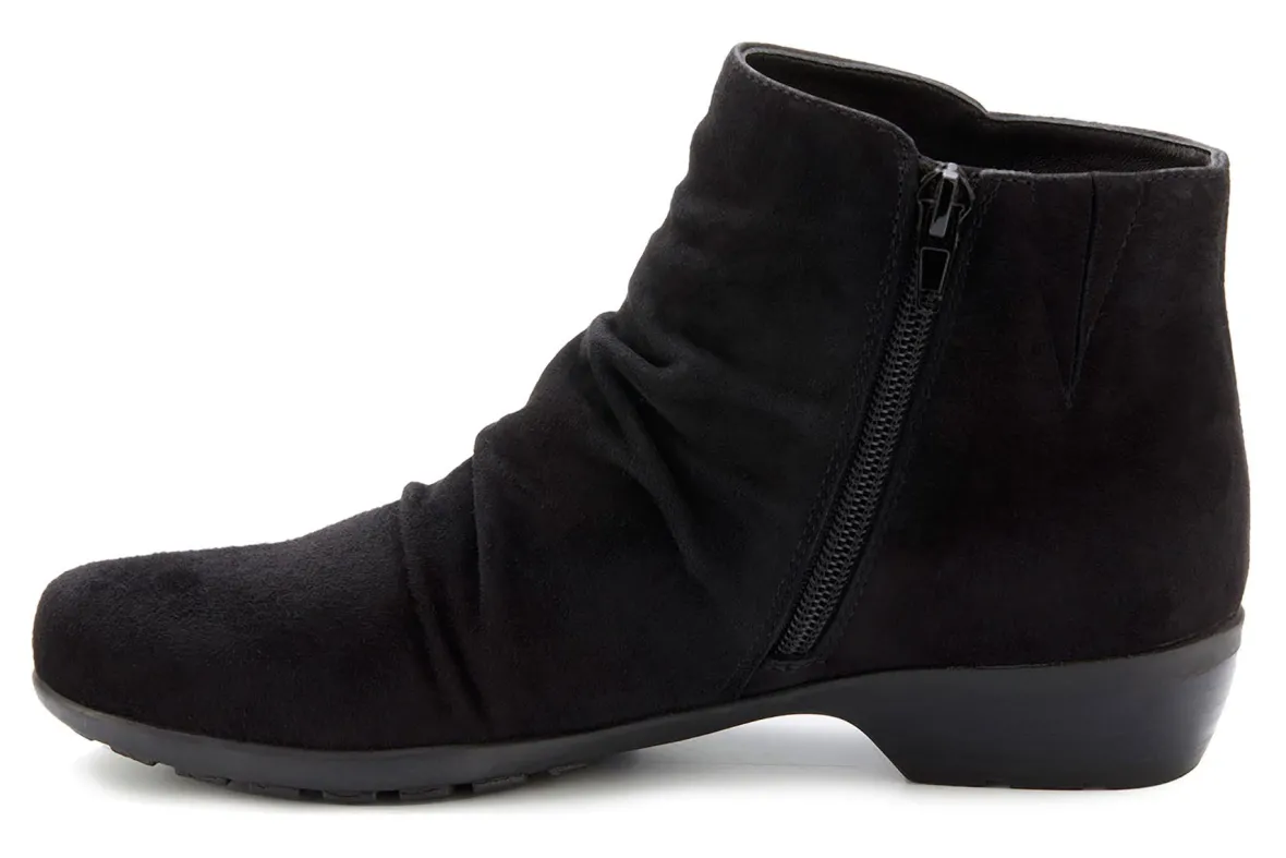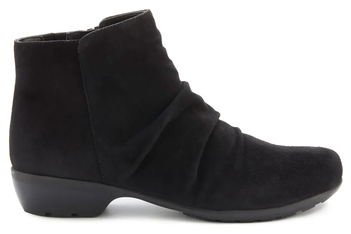 Booties are a fall essential to every wardrobe and Esme by Ros is a standout choice. Featuring beautiful leather or soft suede and ruched detailing on the vamp, an inside zipper makes it easy to get on and off, while discreet gore near the zipper allows flexibility around the ankle. A roomy, walled toe box provides plenty of space for your toes. Signature Tiny Pillows insoles feel amazing with every step you take! The stacked-look heel is just the right height for keeping your heels pain-free.