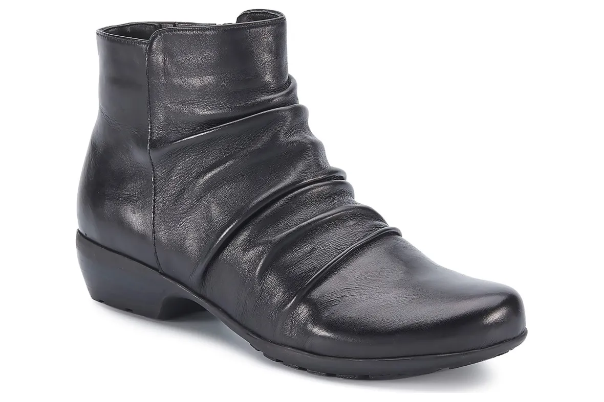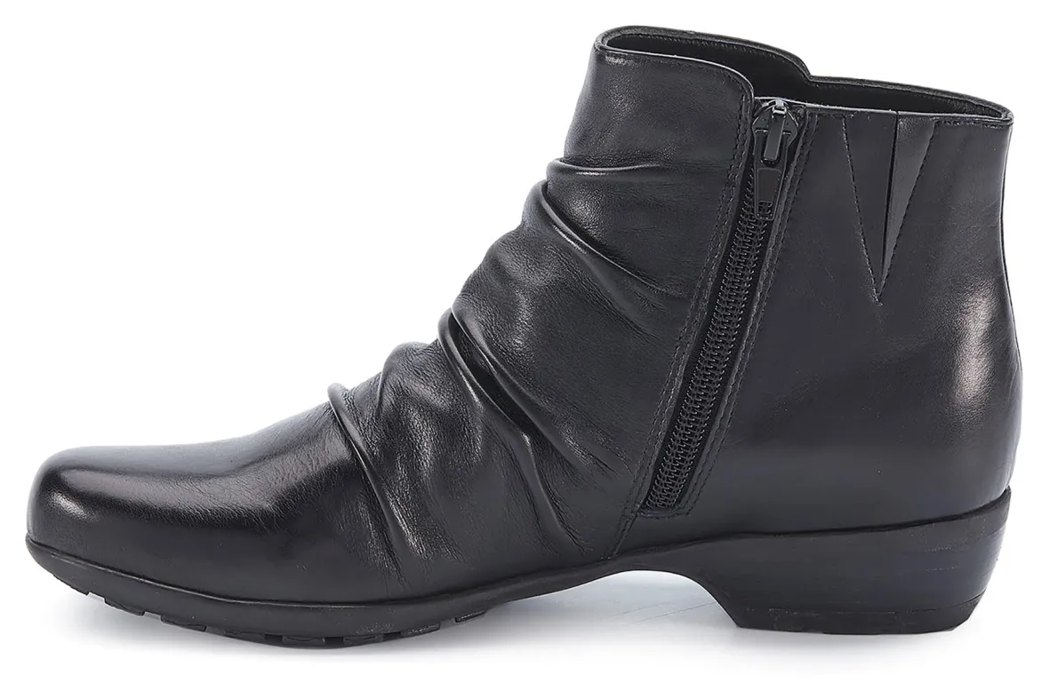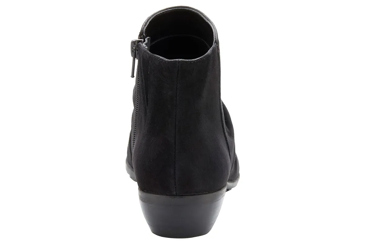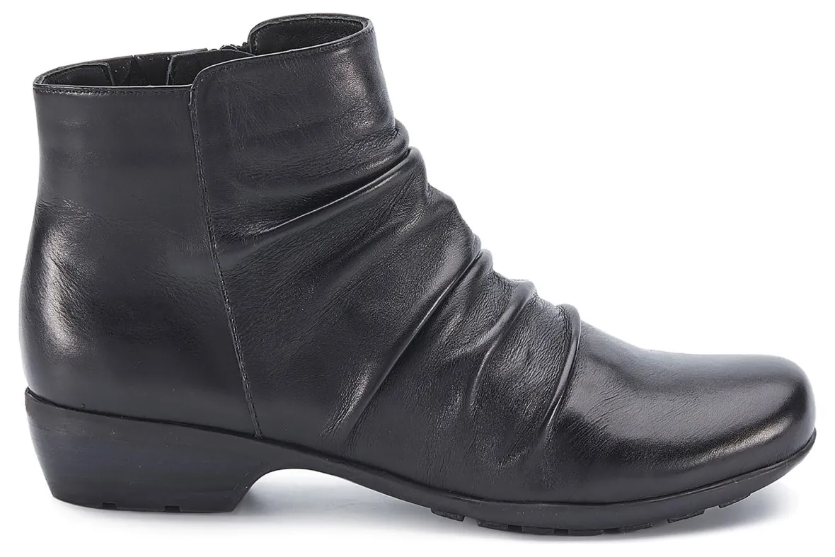 Booties are a fall essential to every wardrobe and Esme by Ros is a standout choice. Featuring beautiful leather or soft suede and ruched detailing on the vamp, an inside zipper makes it easy to get on and off, while discreet gore near the zipper allows flexibility around the ankle. A roomy, walled toe box provides plenty of space for your toes. Signature Tiny Pillows insoles feel amazing with every step you take! The stacked-look heel is just the right height for keeping your heels pain-free.
