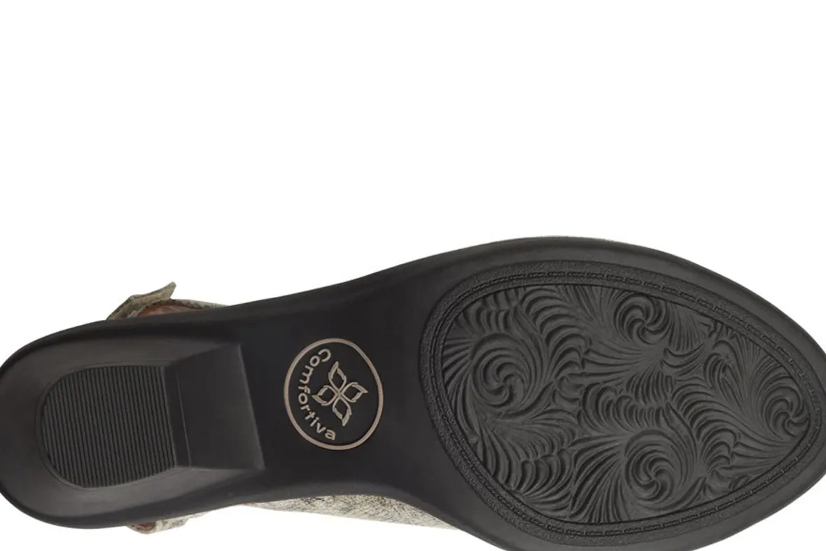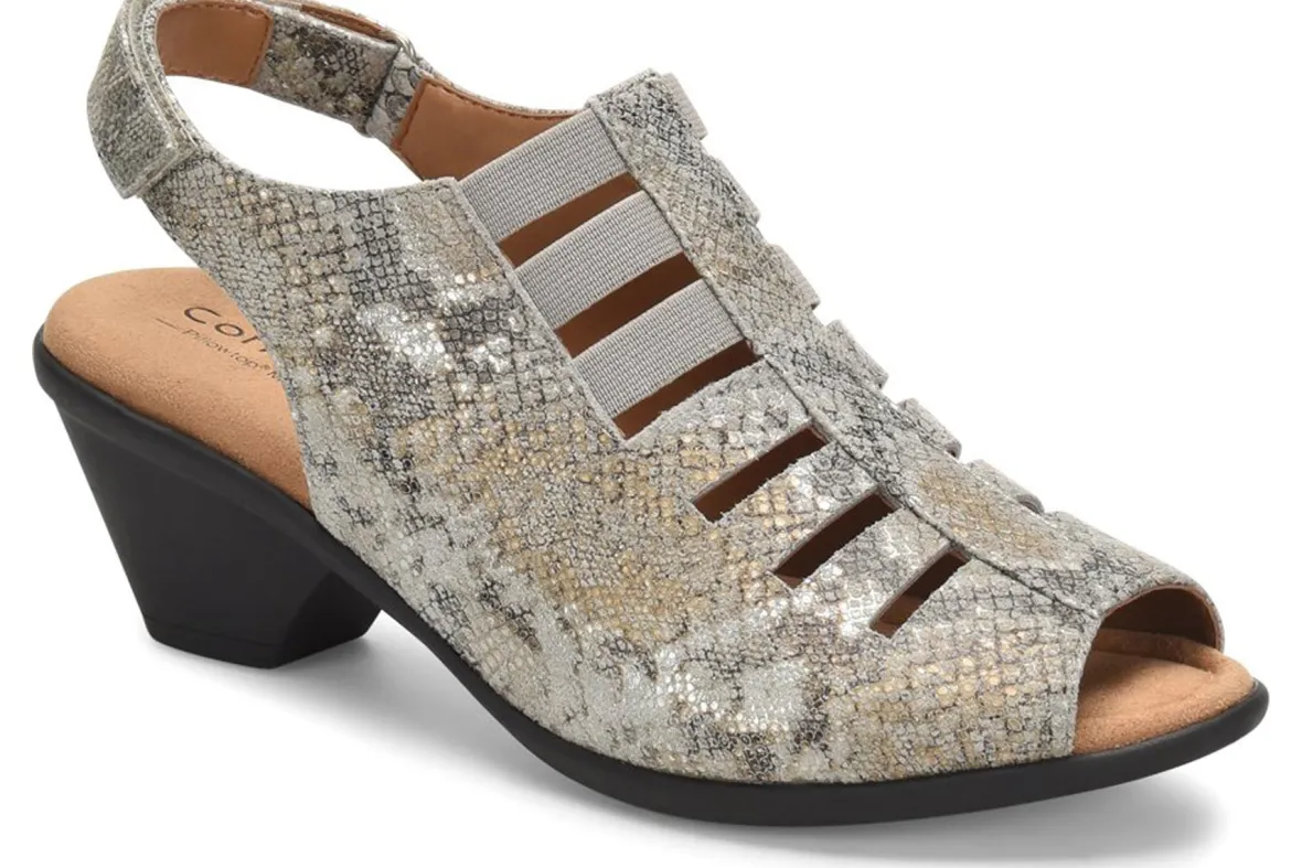 Comfortiva Faye is a strappy sandal built for comfort. Enjoy leather uppers, an adjustable slingback strap, flexible gore and memory foam cushioned footbed. Other features include a breathable synthetic lining, 2-inch heel height and a slip-resistant TPR outsole.