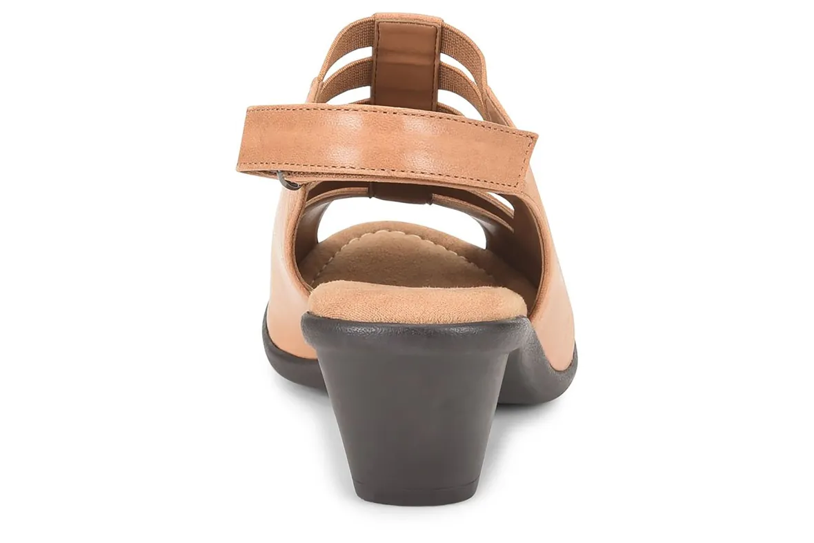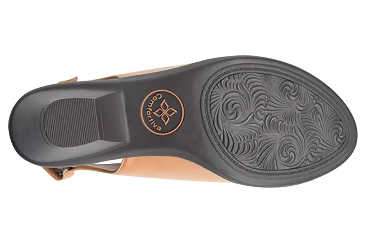 Comfortiva Faye is a strappy sandal built for comfort. Enjoy leather uppers, an adjustable slingback strap, flexible gore and memory foam cushioned footbed. Other features include a breathable synthetic lining, 2-inch heel height and a slip-resistant TPR outsole.