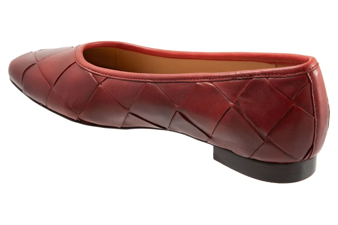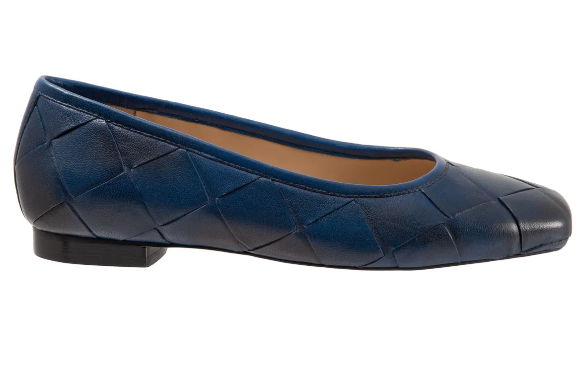 Trotters Hanny is a sleek and comfy ballet flat. Prominent features include oversized woven leather uppers, removable molded EVA footbed and rubber outsole. These flat shoes also have a square toe, odor-resistant sueded microfiber lining and low, ⅝ inch heel height.