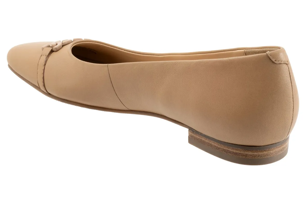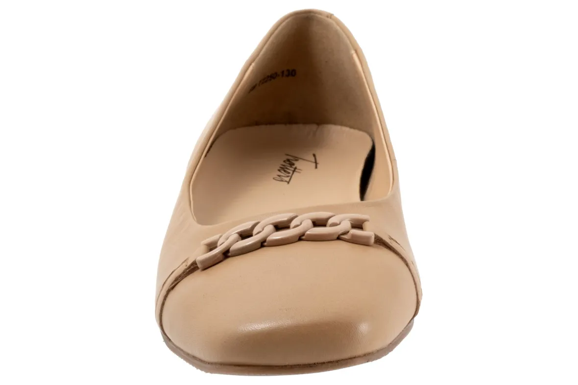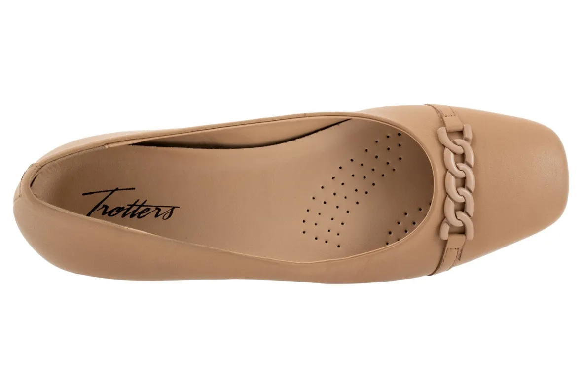 Trotters Harmony is a square-toe flat for any special occasion. These flat shoes have leather uppers, cushioned PU footbeds and lightweight rubberized outsoles. A soft Nappa upper lining, metal chain detailing and a ⅝ inch heel height makes these ballet flats irresistible.
