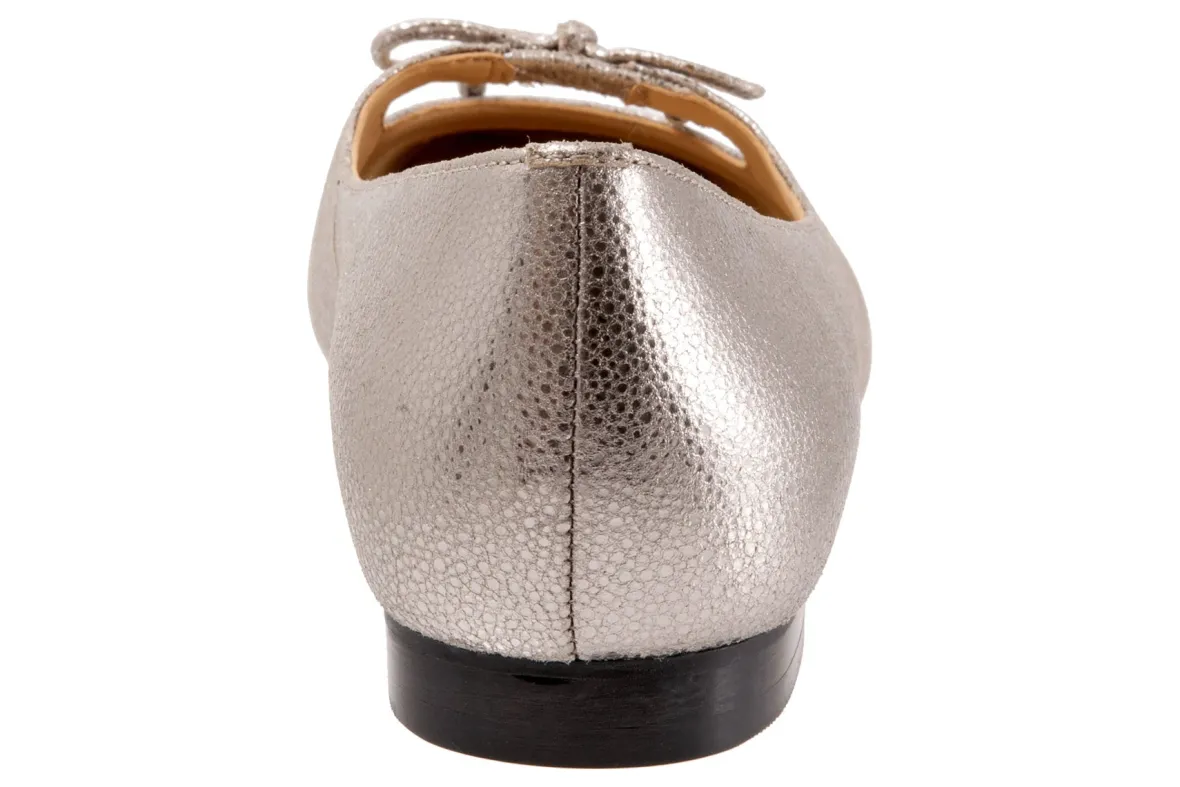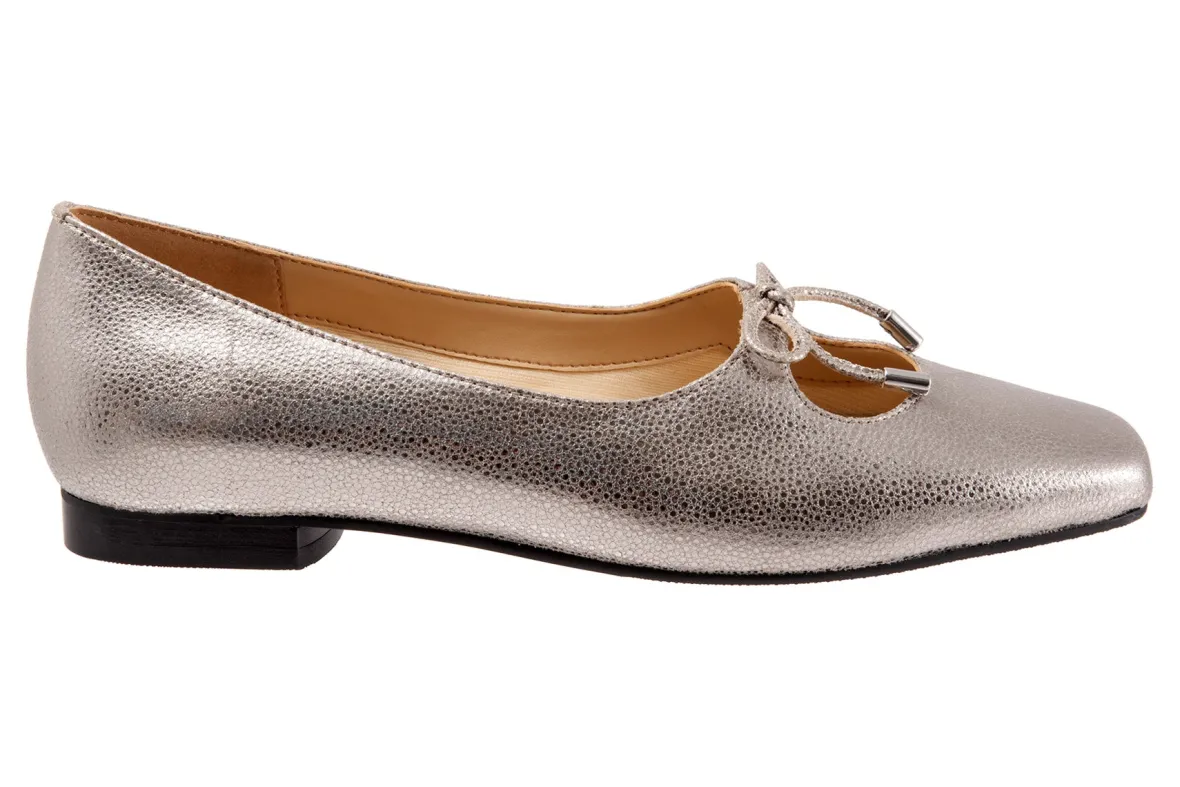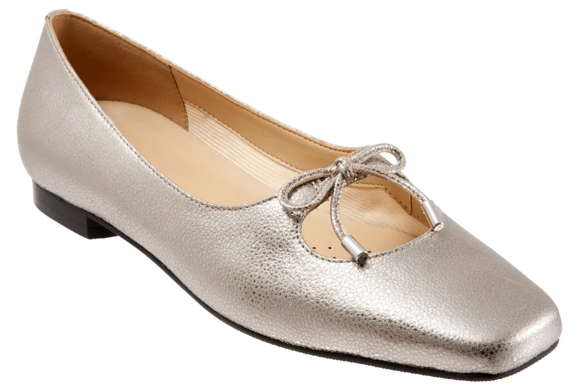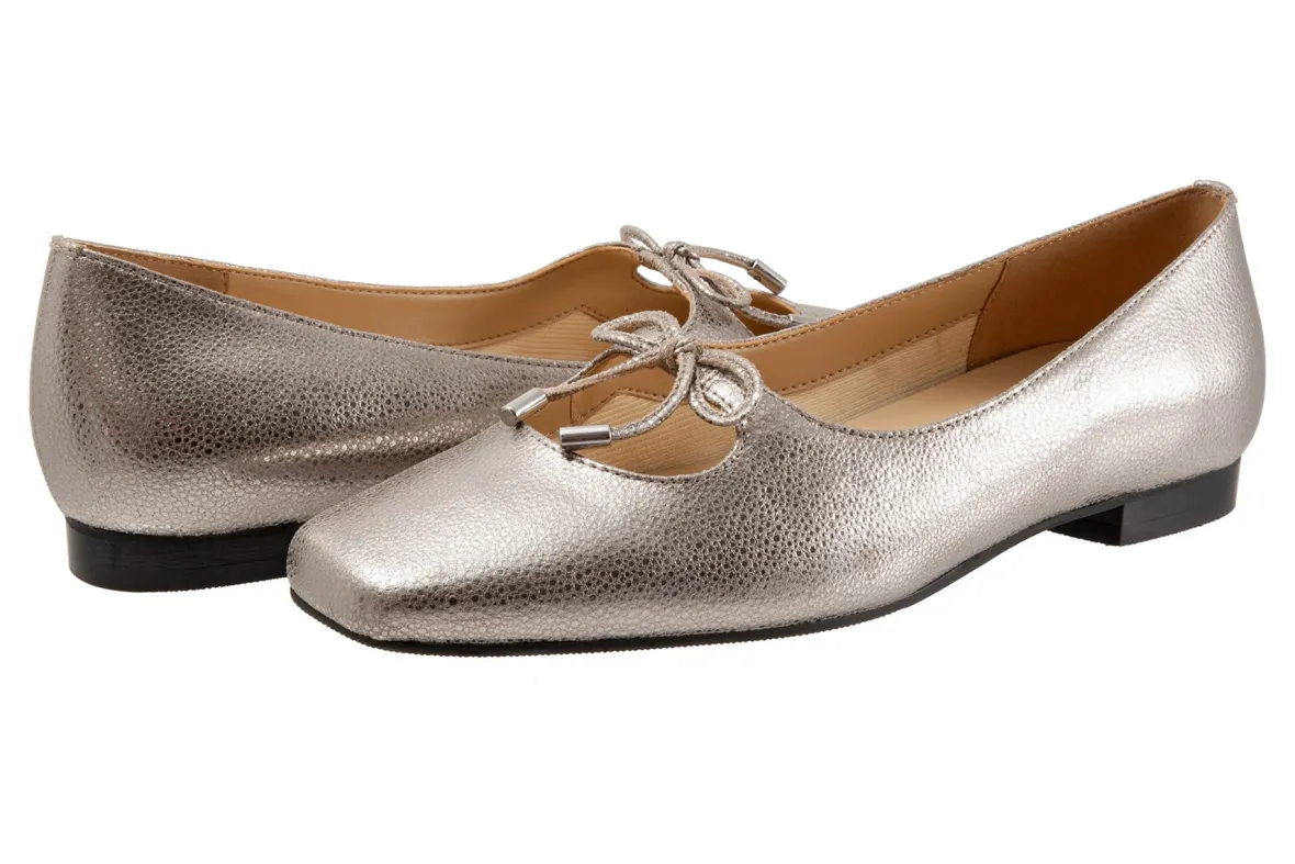 Trotters Honesty is a stylish and lightweight ballet flat. These durable flat shoes have leather uppers, removable molded EVA footbed and rubber outsole. A soft nappa footbed lining, cutout top design, dainty bow and ⅝ inch heel height outlines these cute and cozy flats.