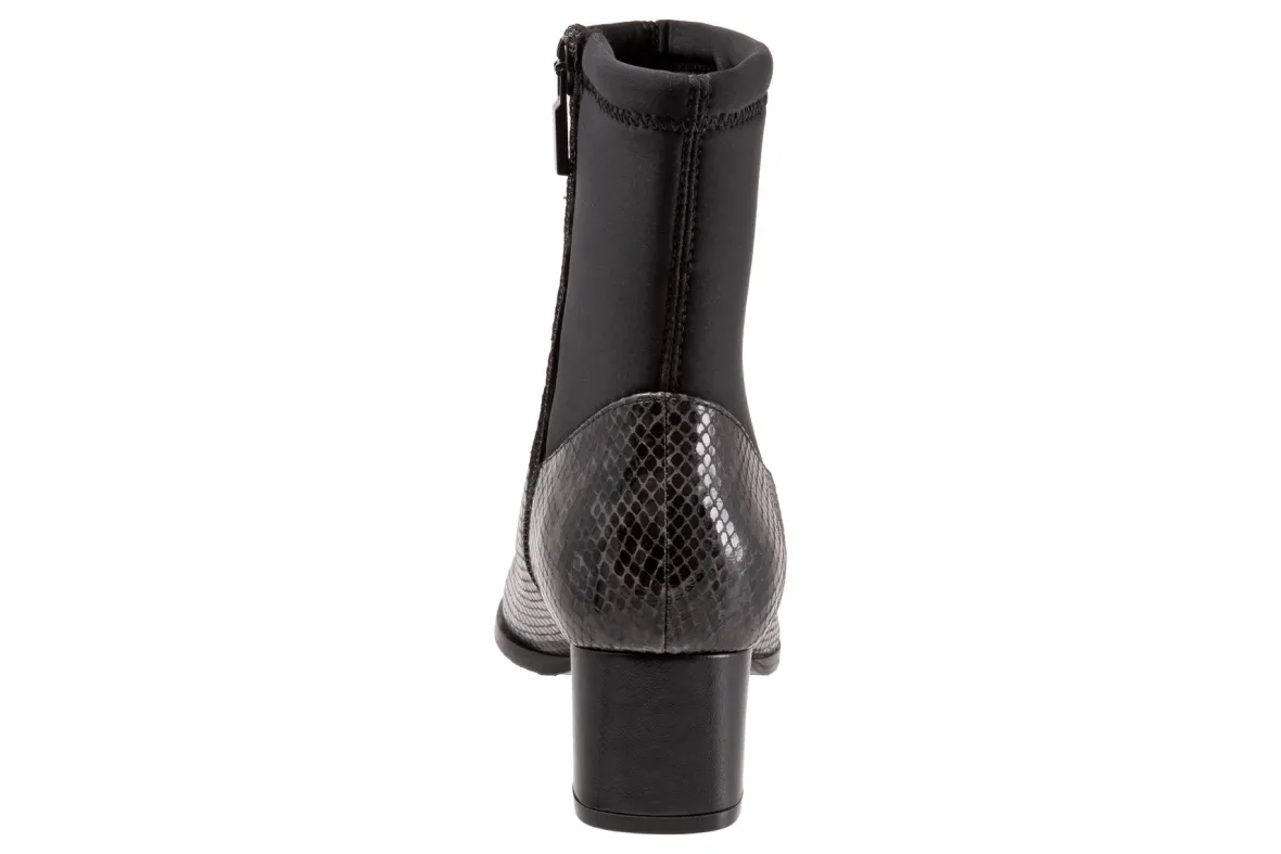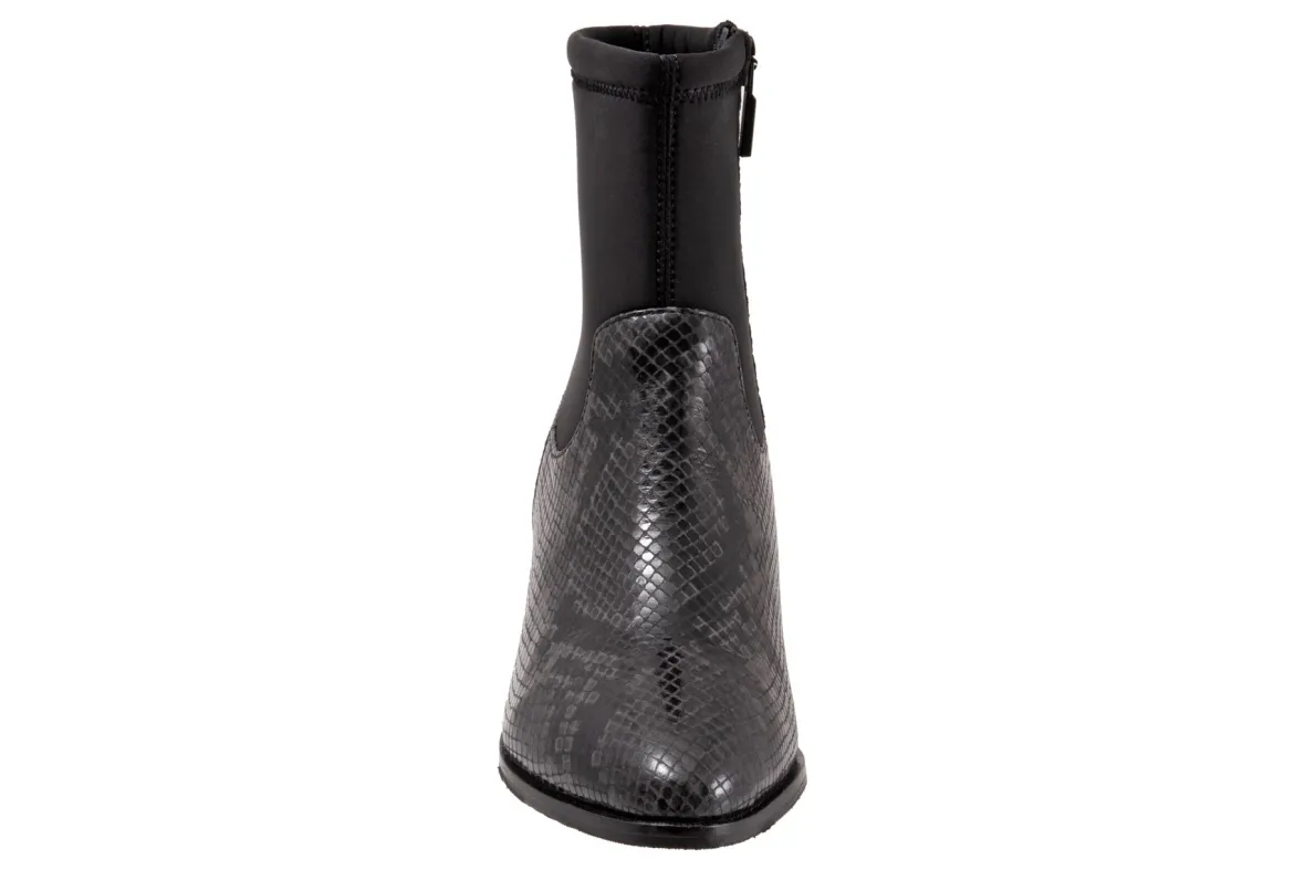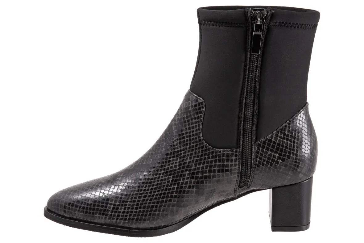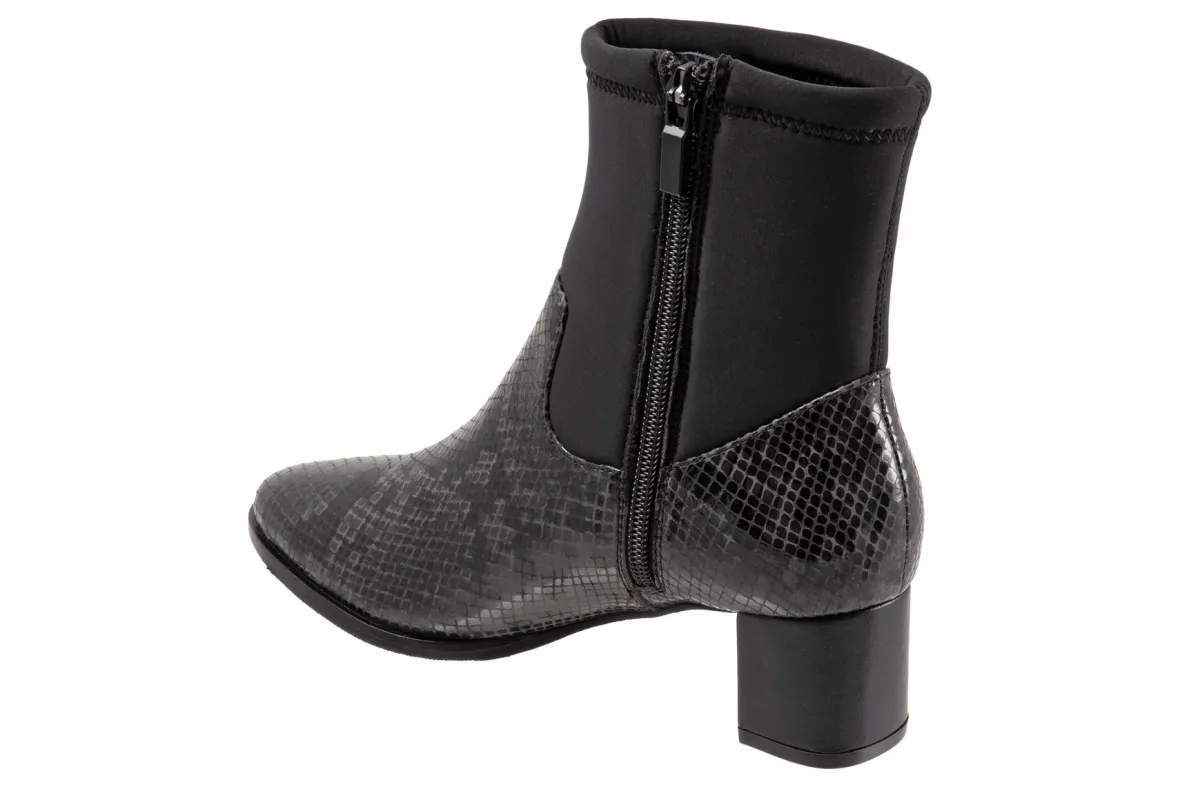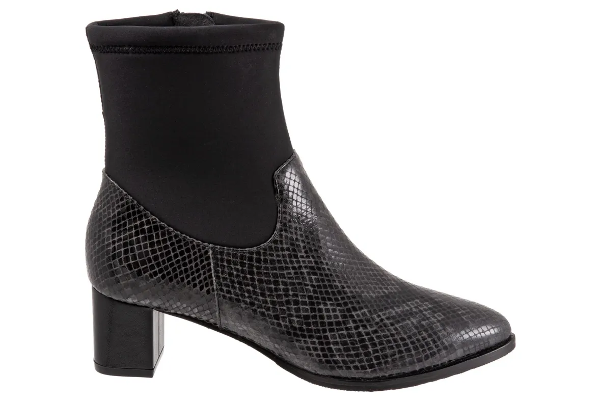 Trotters Kippy is a comfortable and upscale women’s boot. Prominent features include leather and fabric stretch uppers, zipper closure and rubberized outsole. A memory foam insole, soft velvet lining, stretch ankle shaft, 2-inch heel height and 5 ¾ inch shaft height outlines these unforgettable boots.