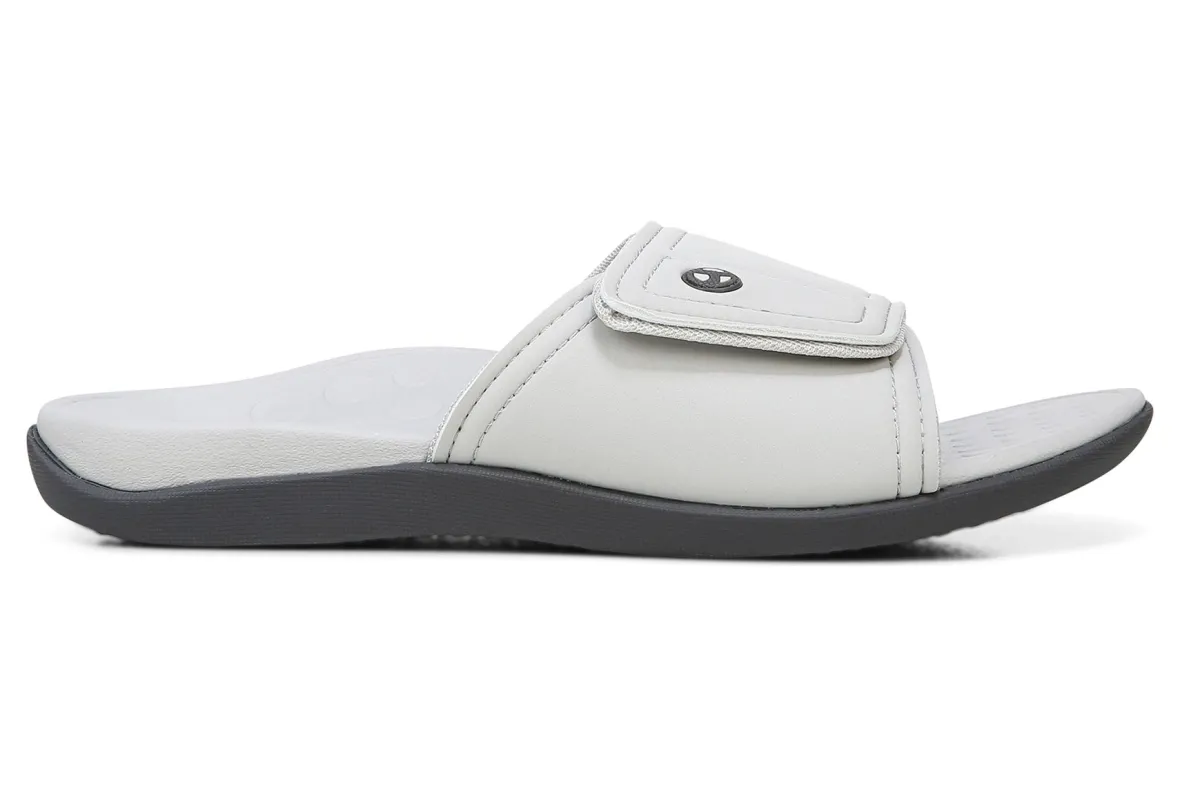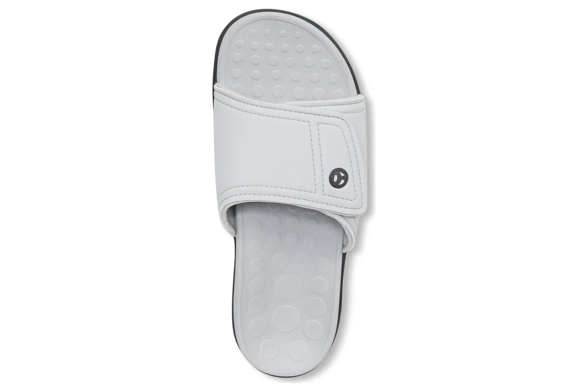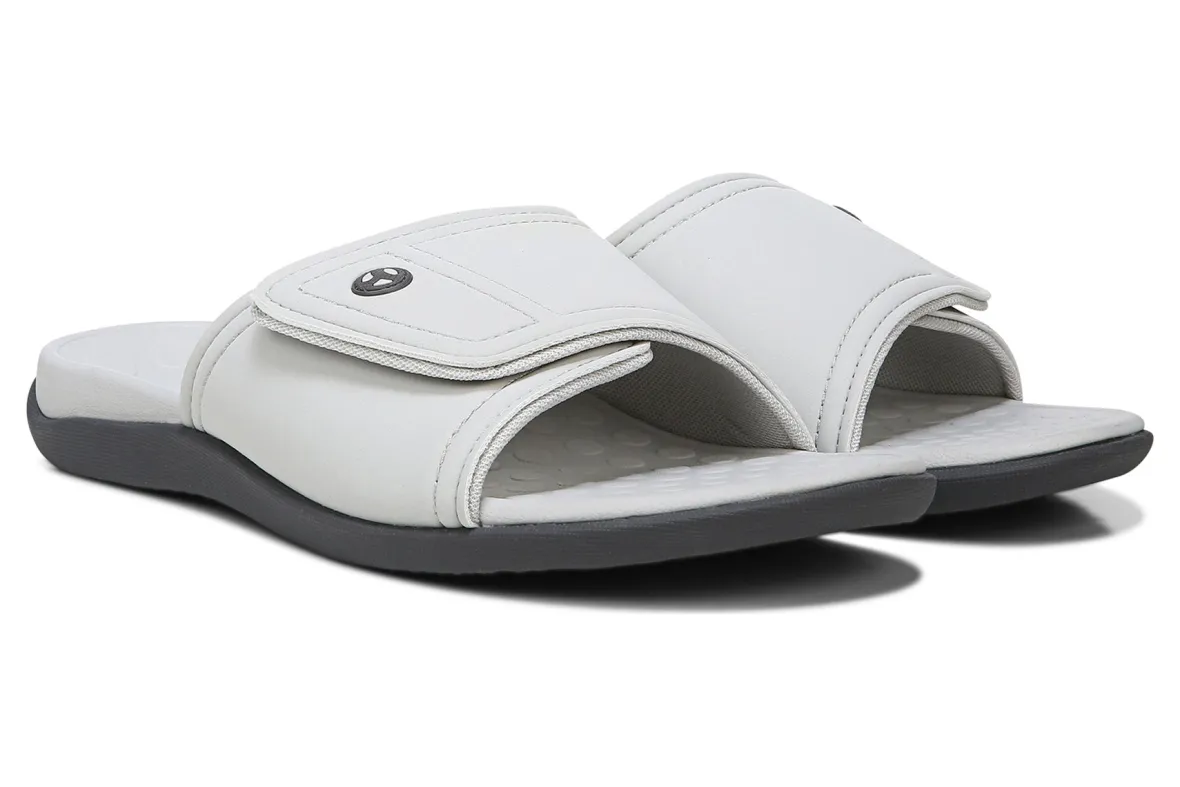 Vionic Kiwi is a sporty and comfortable unisex slide sandal. Prominent features include water-resistant padded uppers, a hook and loop closure, EVA midsoles and durable TPR outsoles. A quick-dry sports mesh wicks away moisture, while a biomechanical orthotic footbed stabilizes feet and supports natural alignment.Vionic Technology cushions arches, helps to alleviate heel pain and plantar fasciitis and has received an APMA Seal of Acceptance.