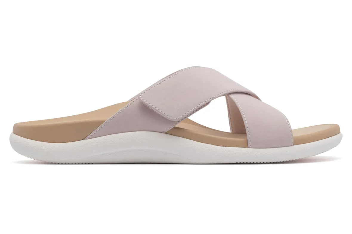 With a built-in orthotic footbed and a sturdy rubber outsole, the ABEO Laguna Slide Metatarsal sandal reduces fatigue and enhances foot support. The soft and flexible moisture-wicking lycra lining improves breathability, keeping your feet dry and cool. Pick from a wide variety of options, silver slide, beige slide, pink slide, and light denim slide.