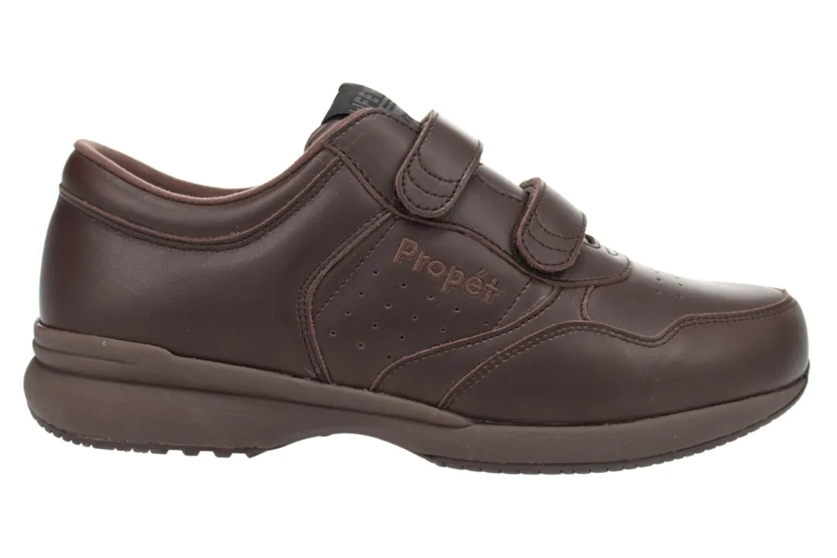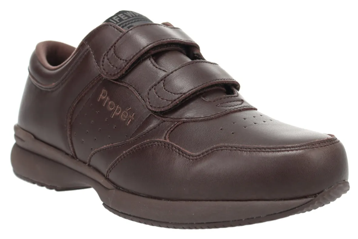 Propet Lifewalker Strap is a supportive men’s walking shoe. Features include leather uppers, adjustable straps, a remo…