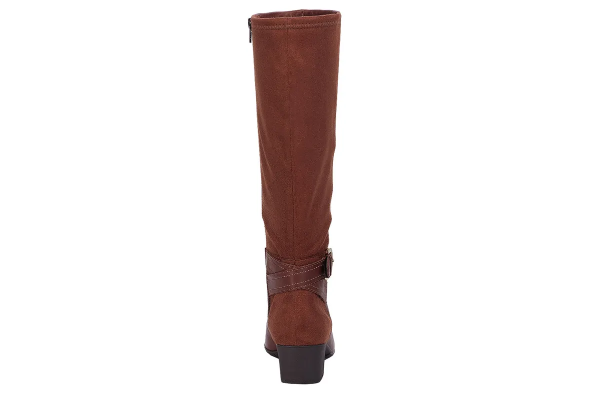 The minute you zip up Max by Ros, you’ll realize you’re wearing the most comfortable boot ever! A broad, rounded toe with plenty of wiggle room, cozy knit fit linings, and cushioned insoles create unbeatable comfort! Made of smooth leather on the front and stretch suede on the calf, Max includes a decorative strap and metal buckle. The 1 1/2 inch block heel is part of a rubber unit bottom that allows for easy walking! A full size-zipper makes it easy to put on and take off. This listing is for the medium shaft. Genuine leather and stretch suede uppers Rounded toe Inside zipper Knit fit linings Softly cushioned foam insoles Microfiber sock lining Rubber unit bottom Heel height: 1 1/2 inches Made in Brazil