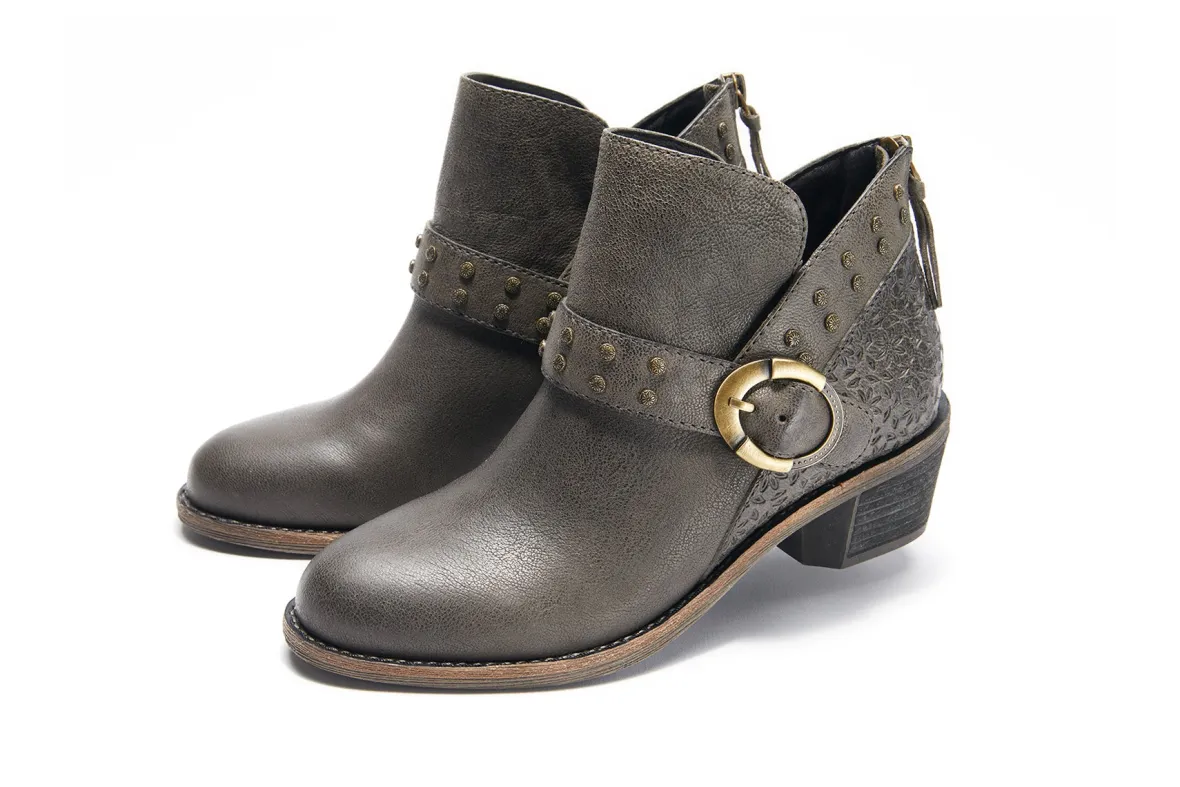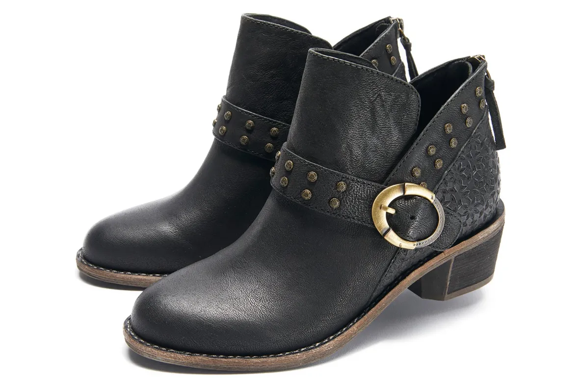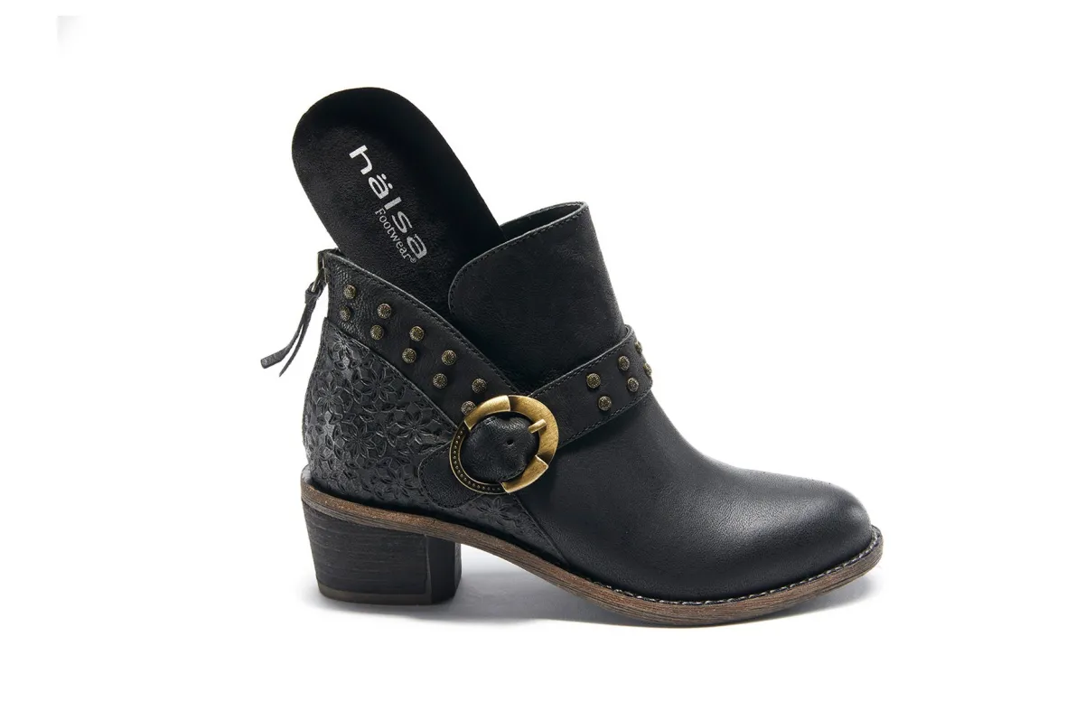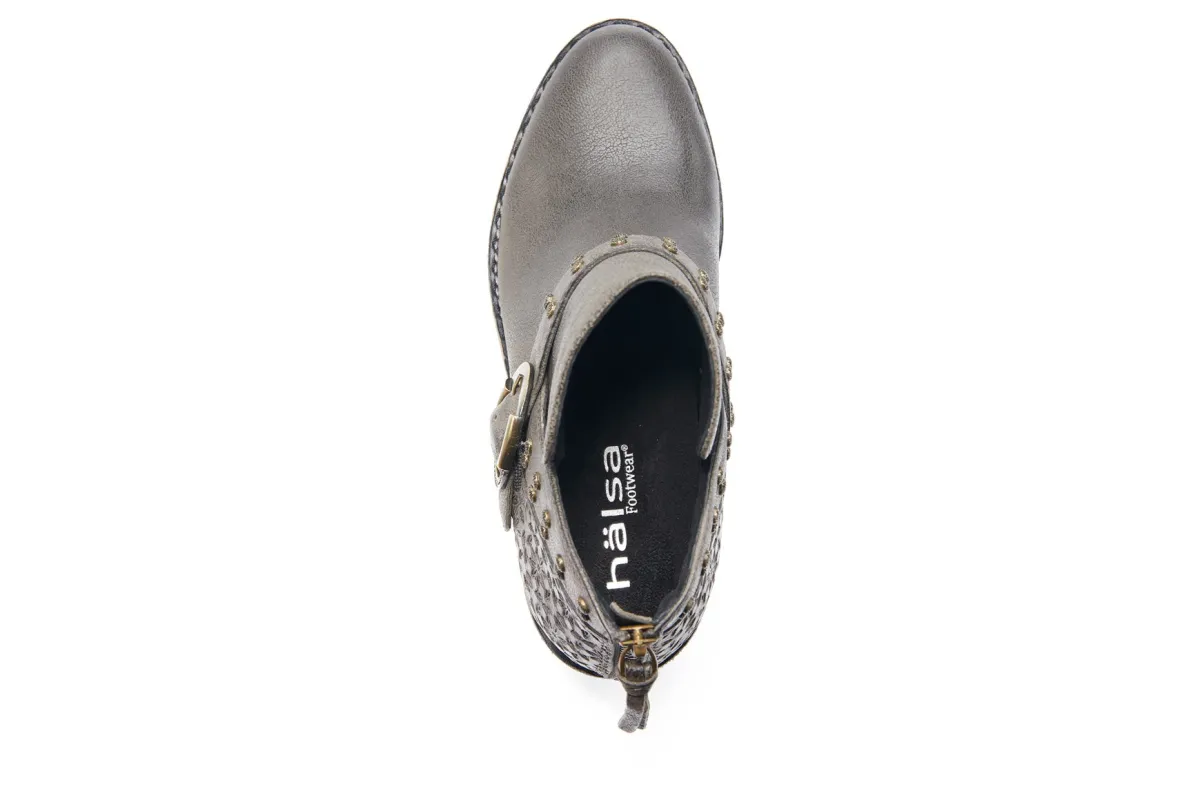 Halsa Footwear Melania is a sleek and comfortable ankle boot. Features include leather uppers, removable antimicrobial insole and durable rubber outsole. An adjustable buckle and stud detailing, cushioned EVA footbed and textile lining will make these booties a new favorite.