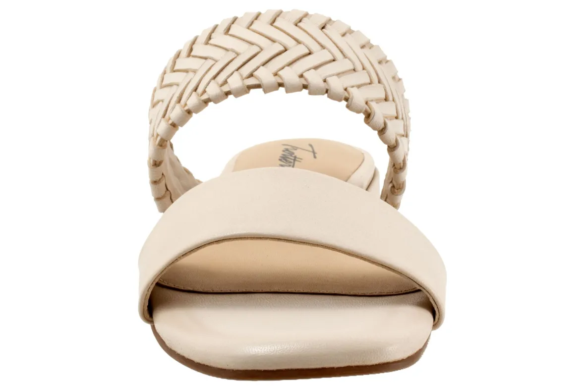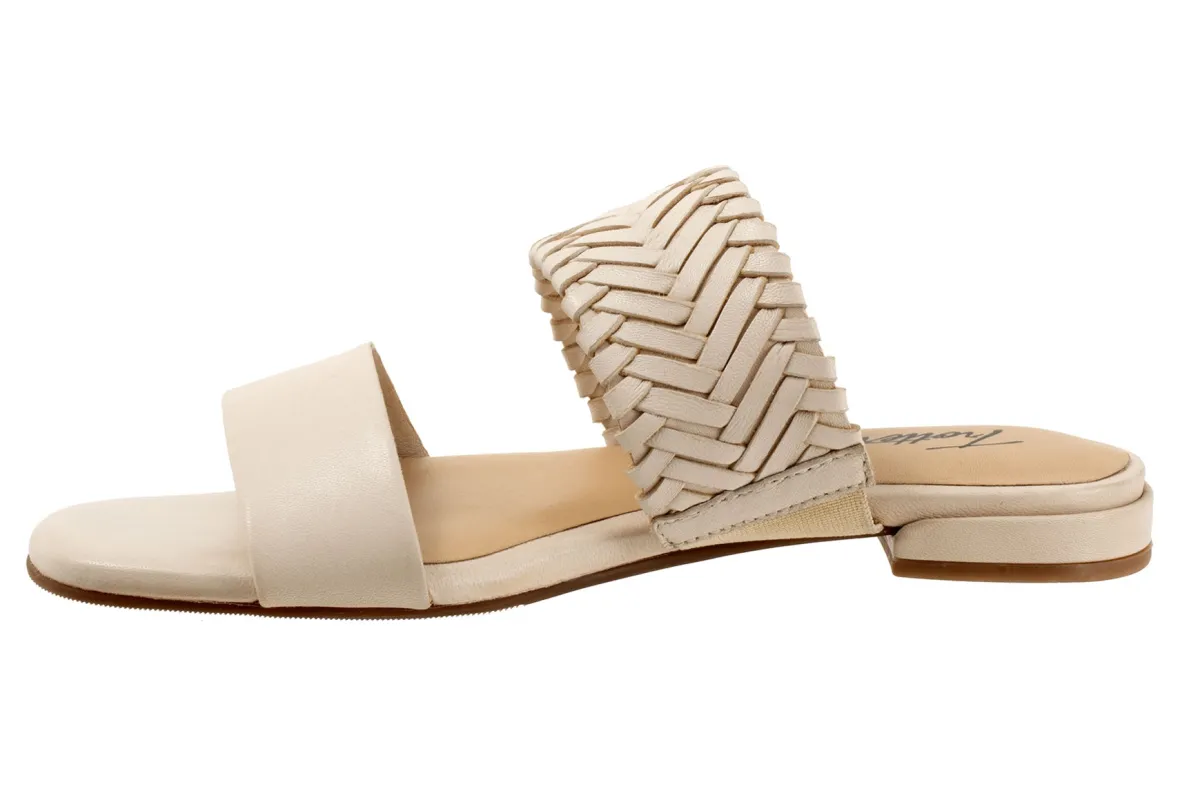 The Trotters Nalane sandal combines a smooth leather strap with a woven leather strap for a fun look. The woven strap has elastic goring on the instep and the lining is all leather for a super-comfortable sandal flat.